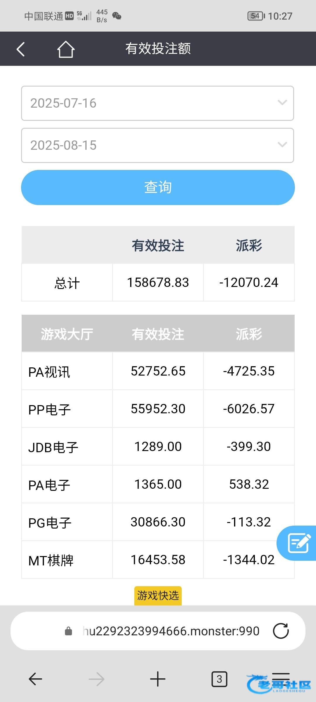 相信老哥们手里不止单玩一个平台,但也有一个主平台常玩的。反正我是这样,这个平台赢了,我不敢玩了,我怕它杀我,然后用这个平台赢的去别的台玩,杀光。越杀我越不服,每次都想着这个台子赢一次差不多输掉的就再也不玩这个平台,可是就是有多少杀多少,总觉得狗庄良心发现,但根本不可能。那我现在陷入两难,赢的台子不敢玩,想去输的台子打回一点结果一直输。到底要怎样啊。我就是怕盈利的台子杀回我,心态都被网赌平台击溃了。我在钱能系列242差不多赢了8个,每次都是赢几千转手就送给那个不服输的傻逼乐虎。没一次赢的,有多少杀多少。我心里想的是继续玩盈利的台子那我不是送死吗。狗庄不是福利社不可能一直让你赢。平台多,吊大的老哥,你们有没有某个平台总体是盈利的,真的不杀回去吗。附图这傻逼bb台子叫乐虎,真一直杀,只能查一个月的
