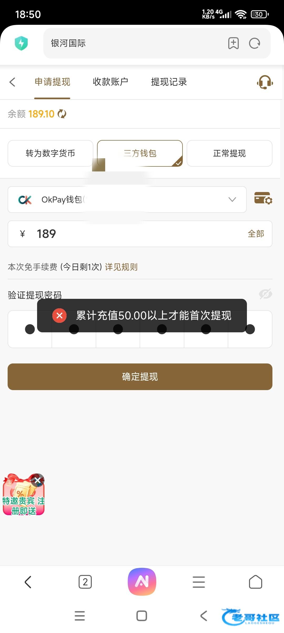 最后2.4,1.2进免费了买PG免费墨西哥爆165,想提189,提示要充值50以上,我充了61,提205到账了