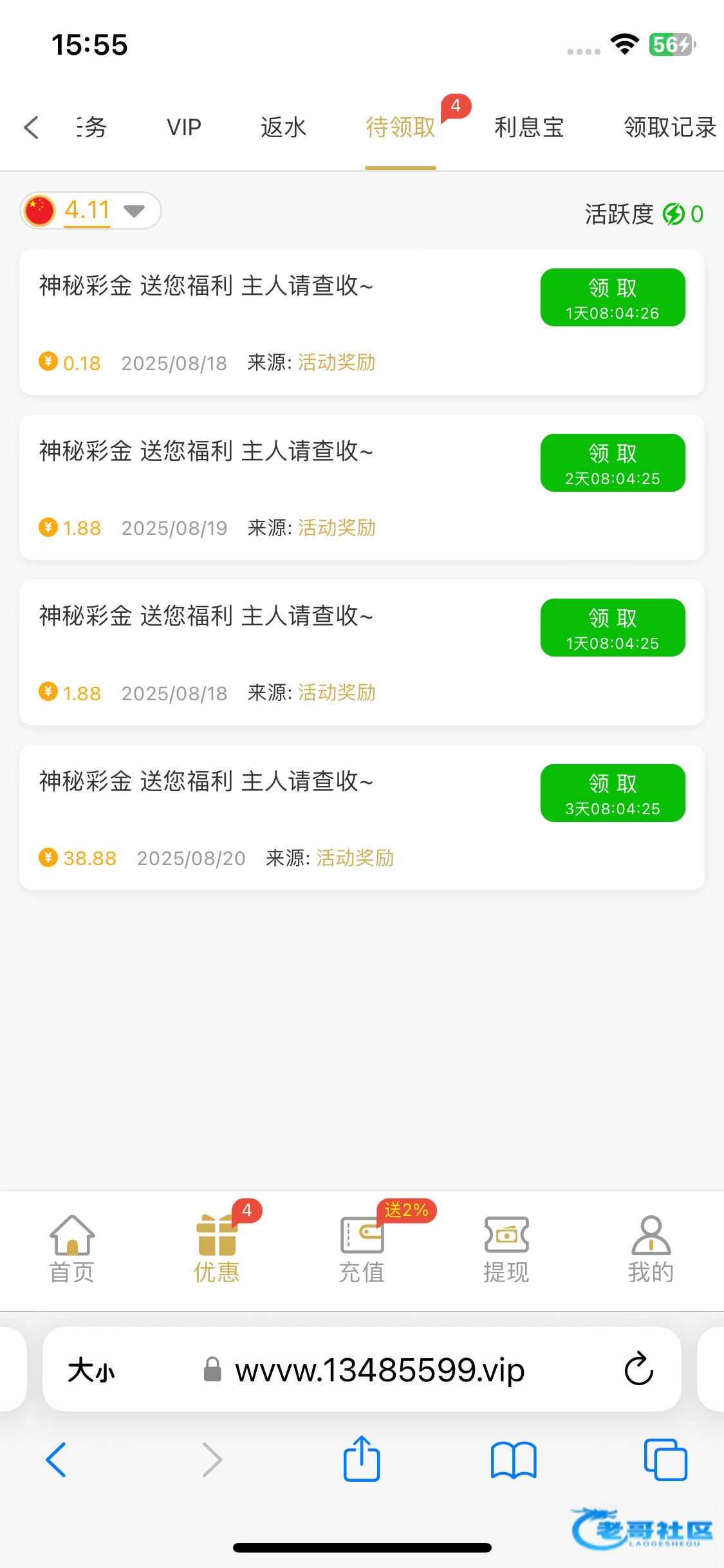 上号就有自助领取。十块二十的充过,每天抢红包抢到金额里面包含连起来的13 34 48就能申请十倍加赠。链接:1348.com