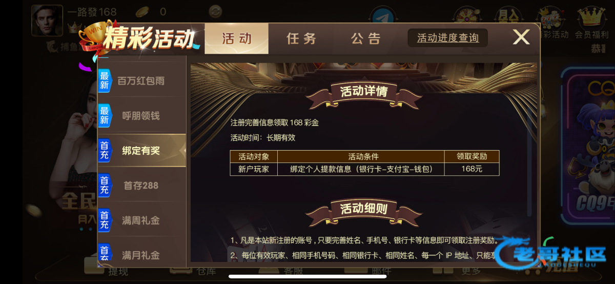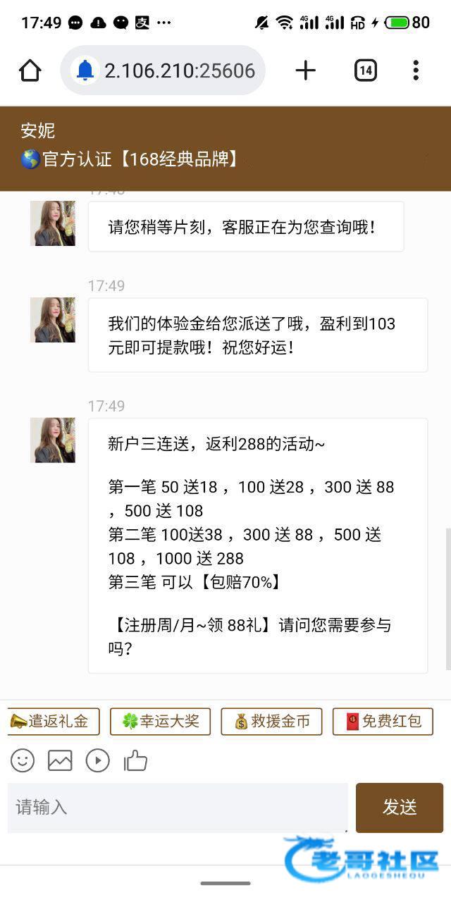 绑定好、找在线客服申请,送8-168,自测吧,我没打出来,赢到103提款 地址: 55q.in