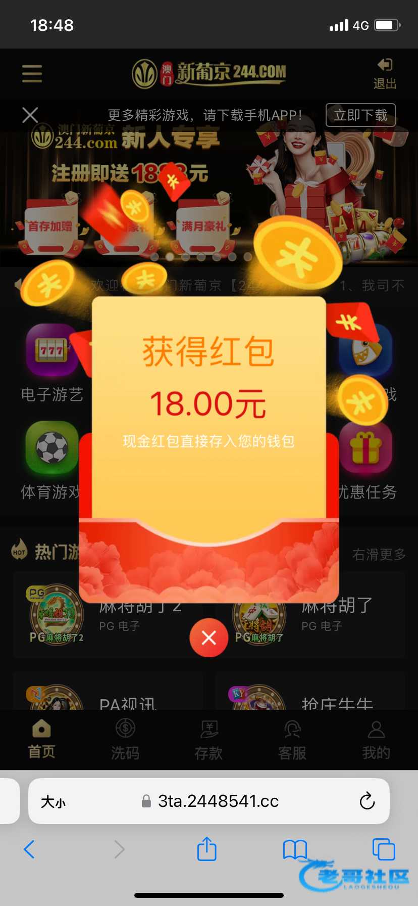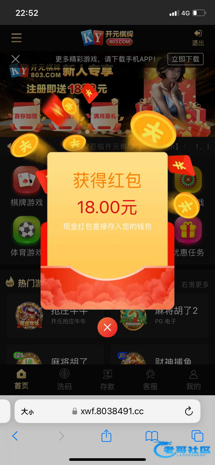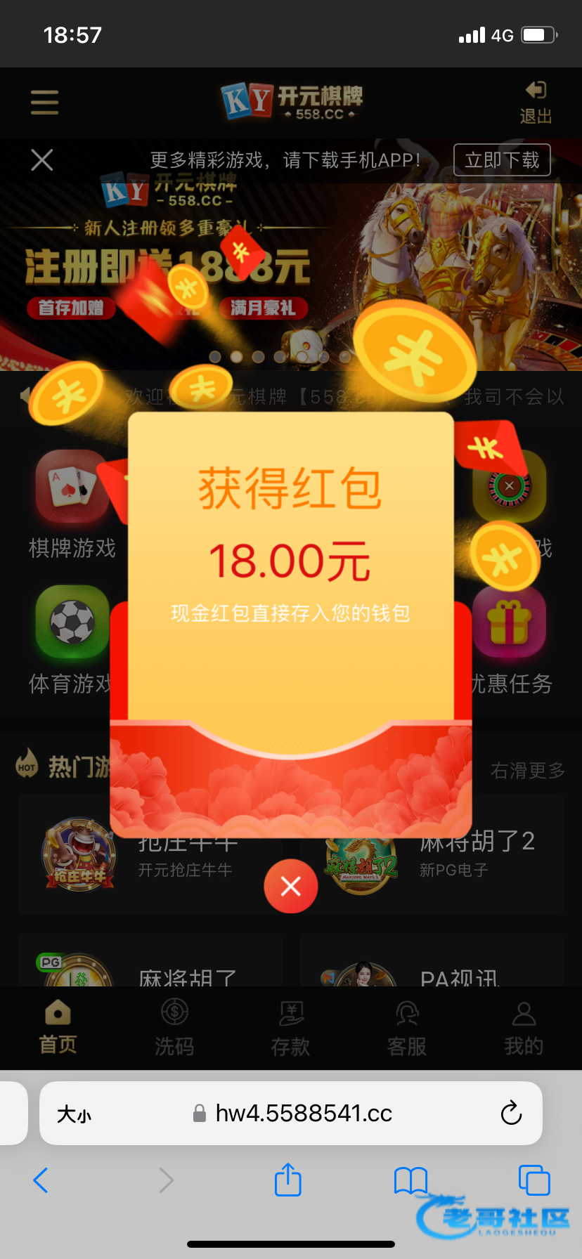 注册不用绑卡,等四五天登陆自动弹18红包,不限制游戏,一百提