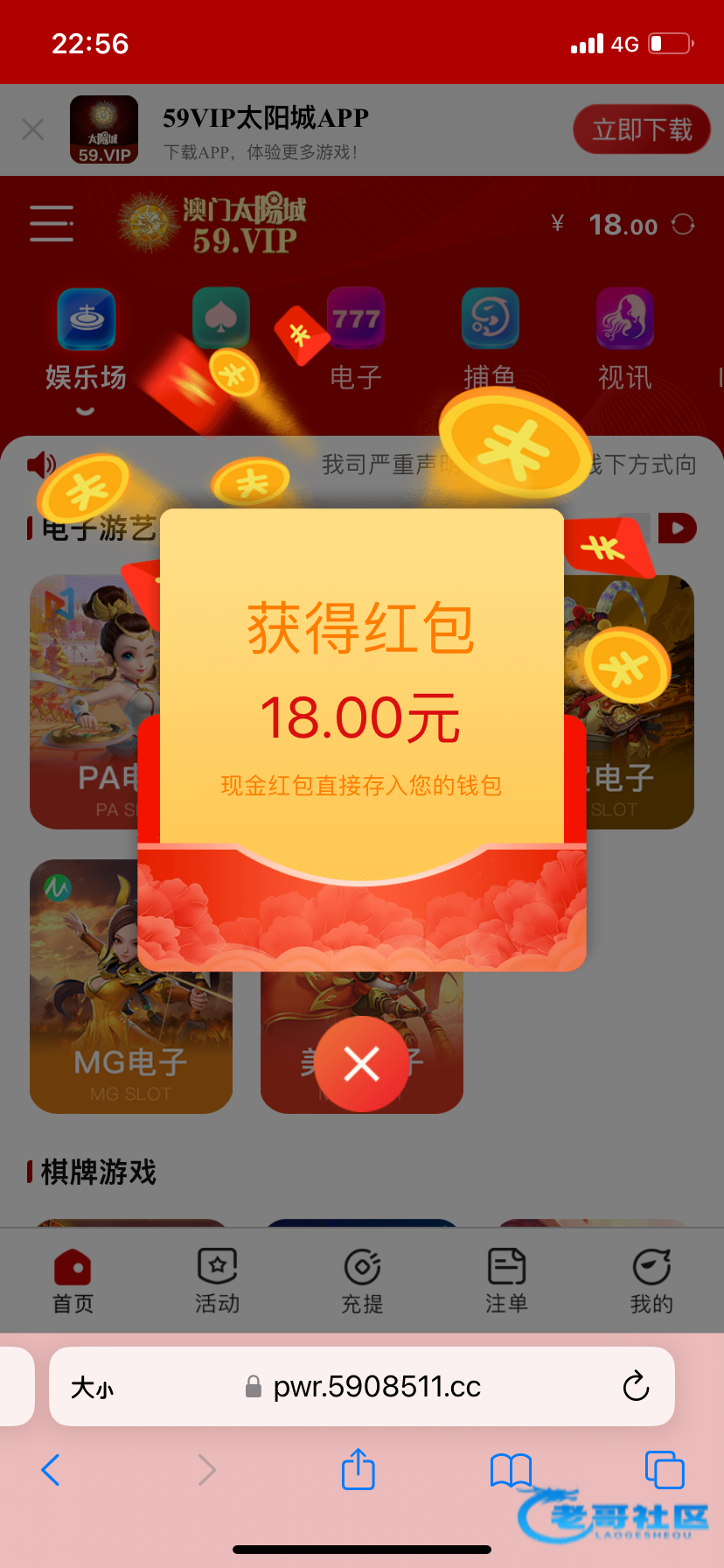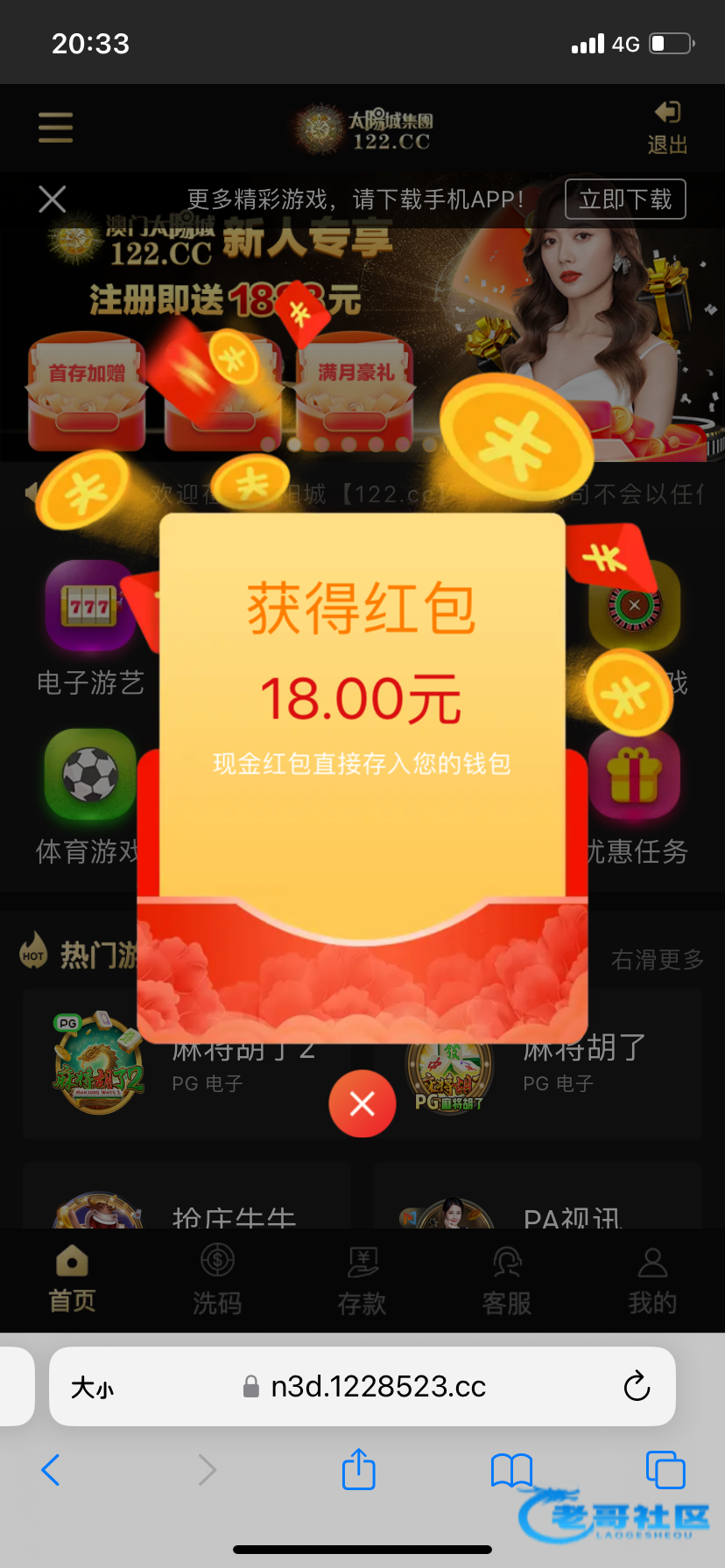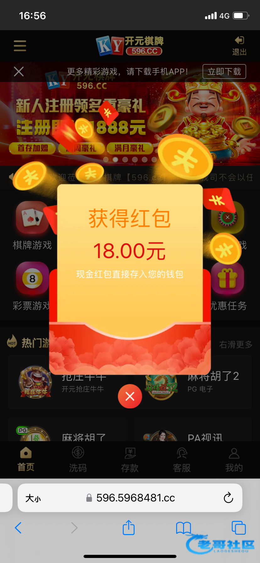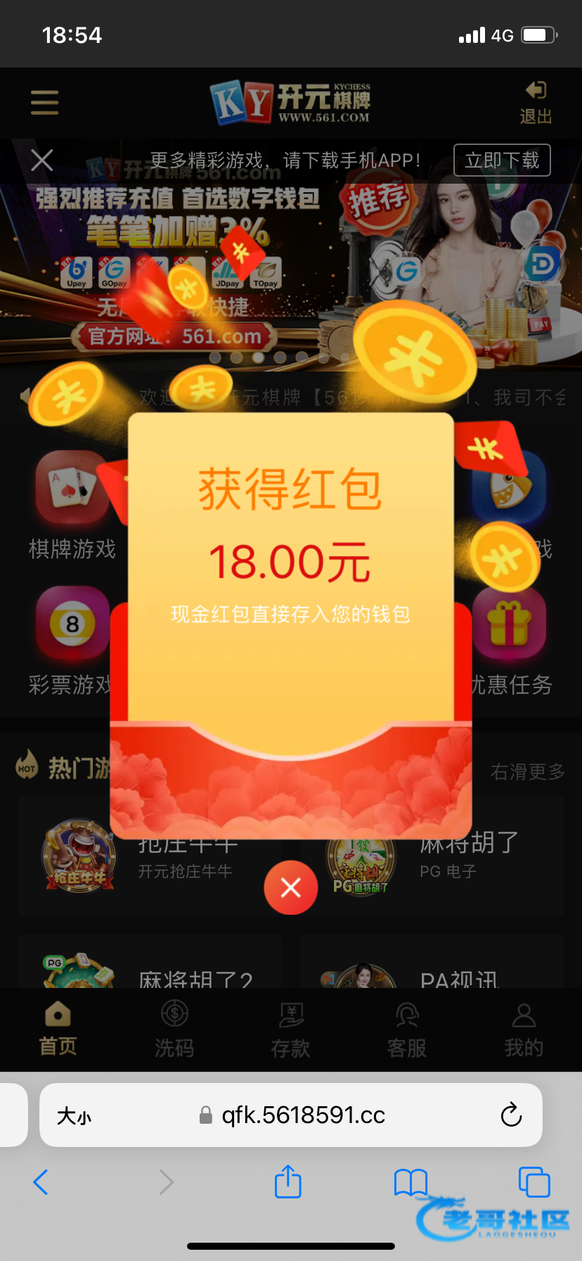 注册不用绑卡,等四五天登陆自动弹18红包,不限制游戏,一百提