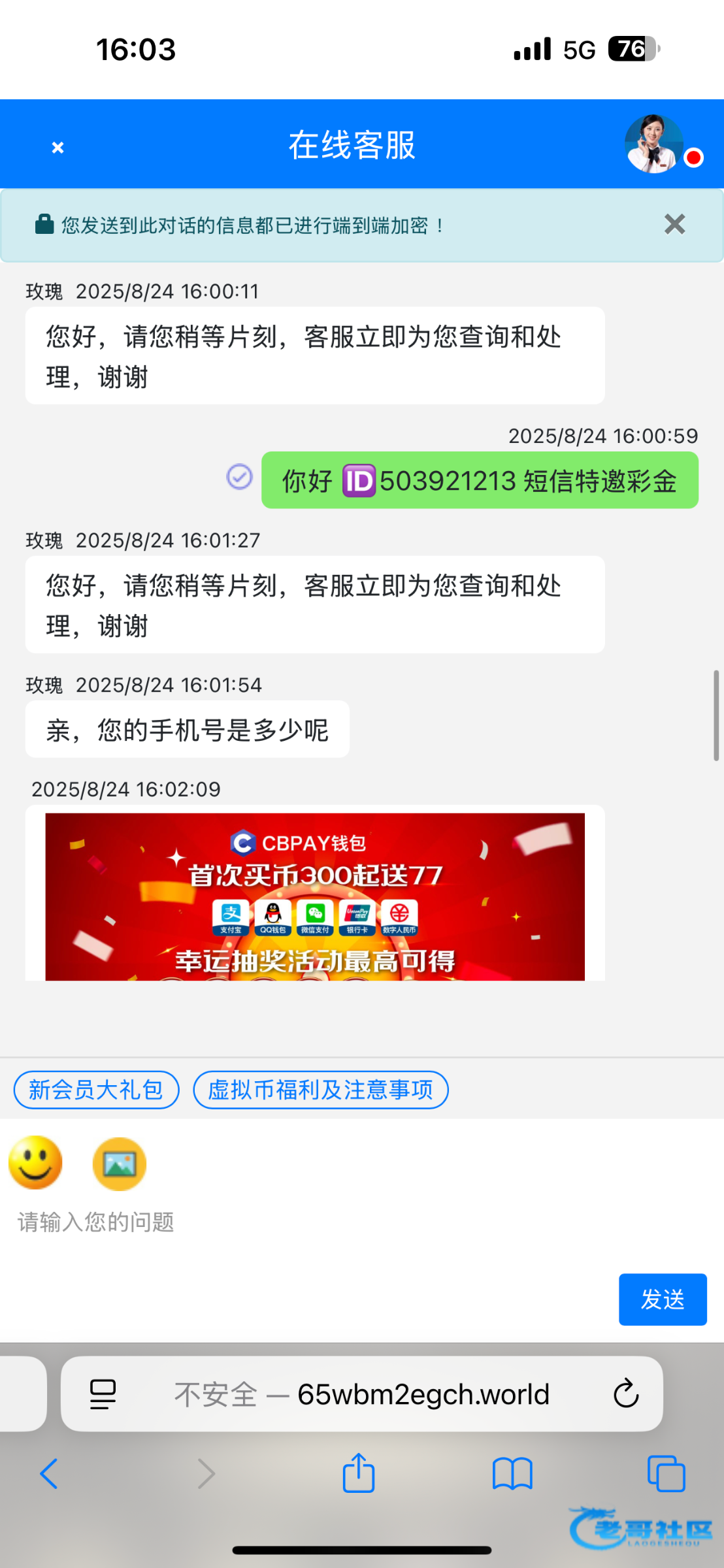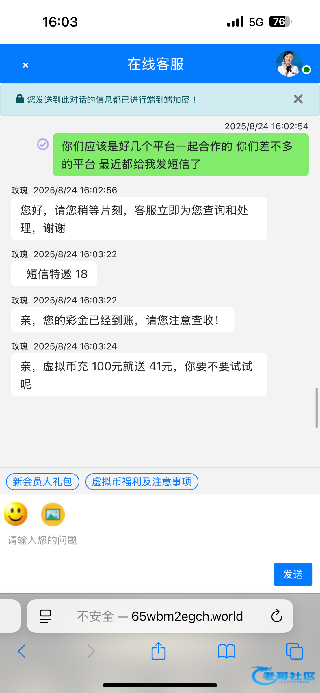 老哥们短信图来了 要是客服不送就跟客服说 注册这么久了之前送的3块彩金最近一直给我发特邀短信又不给我送这是什么意思 反正一直跟客服磨就行