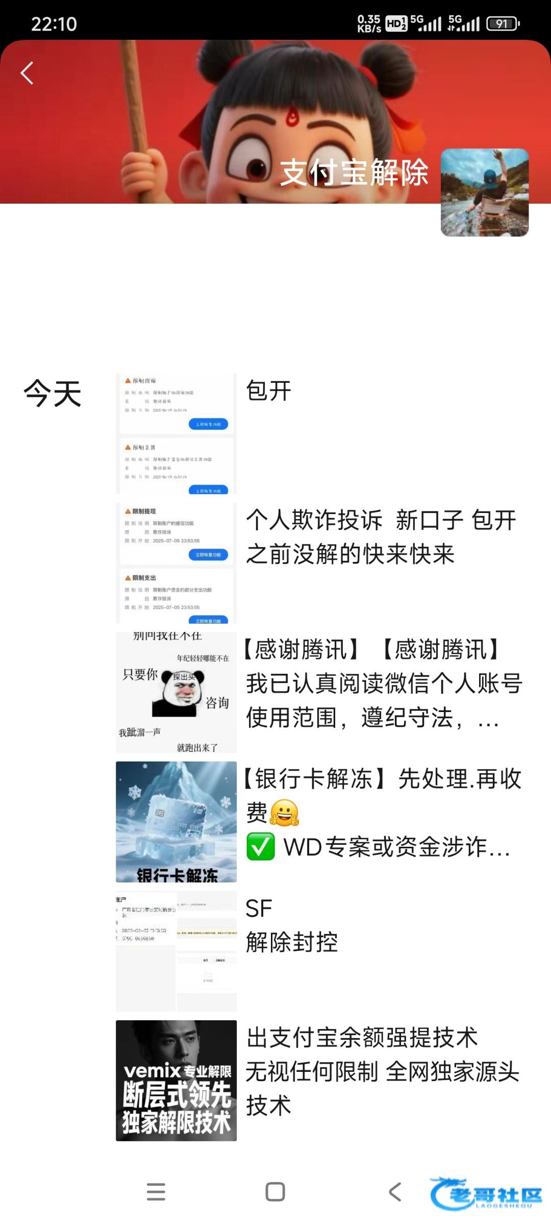 总之不要跑单,他能有本事给你解除,就能有本事搞你。加微信最好,你要看看他朋友圈的内容,注意辨别骗子。保险点,就找先给你解除再付钱的。价格会根据你的限制程度,金额挂钩。总结:闲鱼各种大佬,有什么限制都可以去找找,有的银行卡解除都有,不过我只试了支付宝限制解除的。