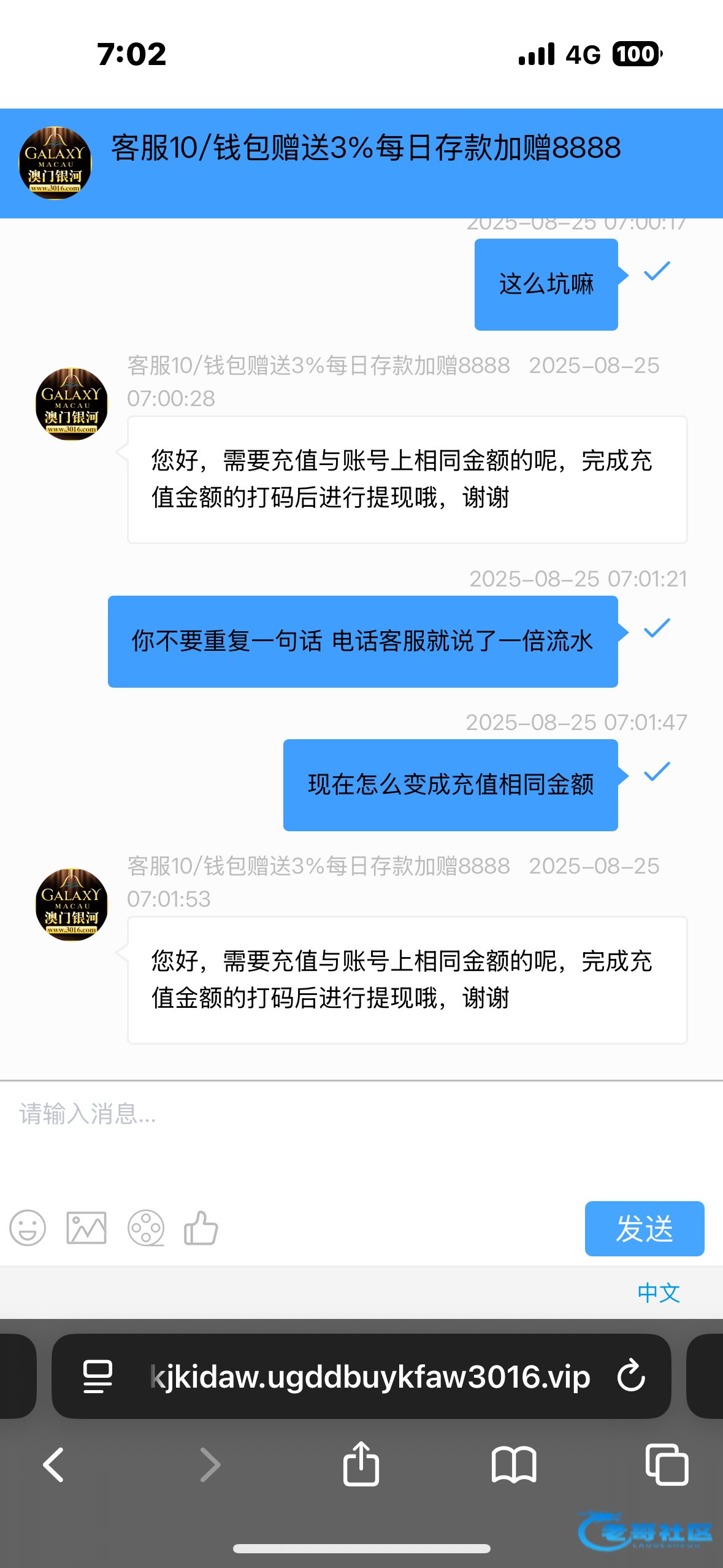 接到3016客服电话说是送彩金又说一倍流水提现 登进账号送了18打到500不让提现说是充值相同金额打码后才能提现 真的太黑了 目前账号内有600多客服人机一样重复一句话 还黑了我100块