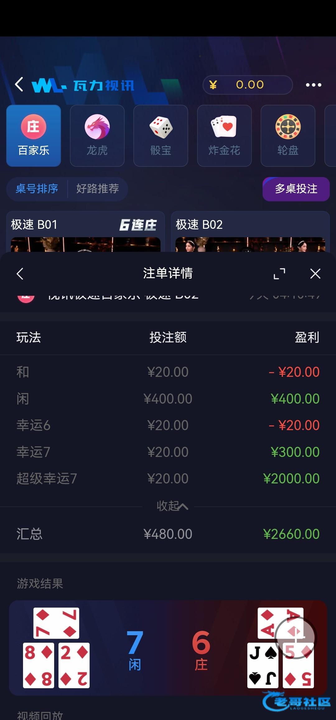 刚4064发周俸禄领了35加5快彩金,想着过两关就提,第一把进去买闲开了和,就不知道改下什么了,直接买了两边对子加超级幸运7,一把40变1290,终于吃的得起猪脚饭了