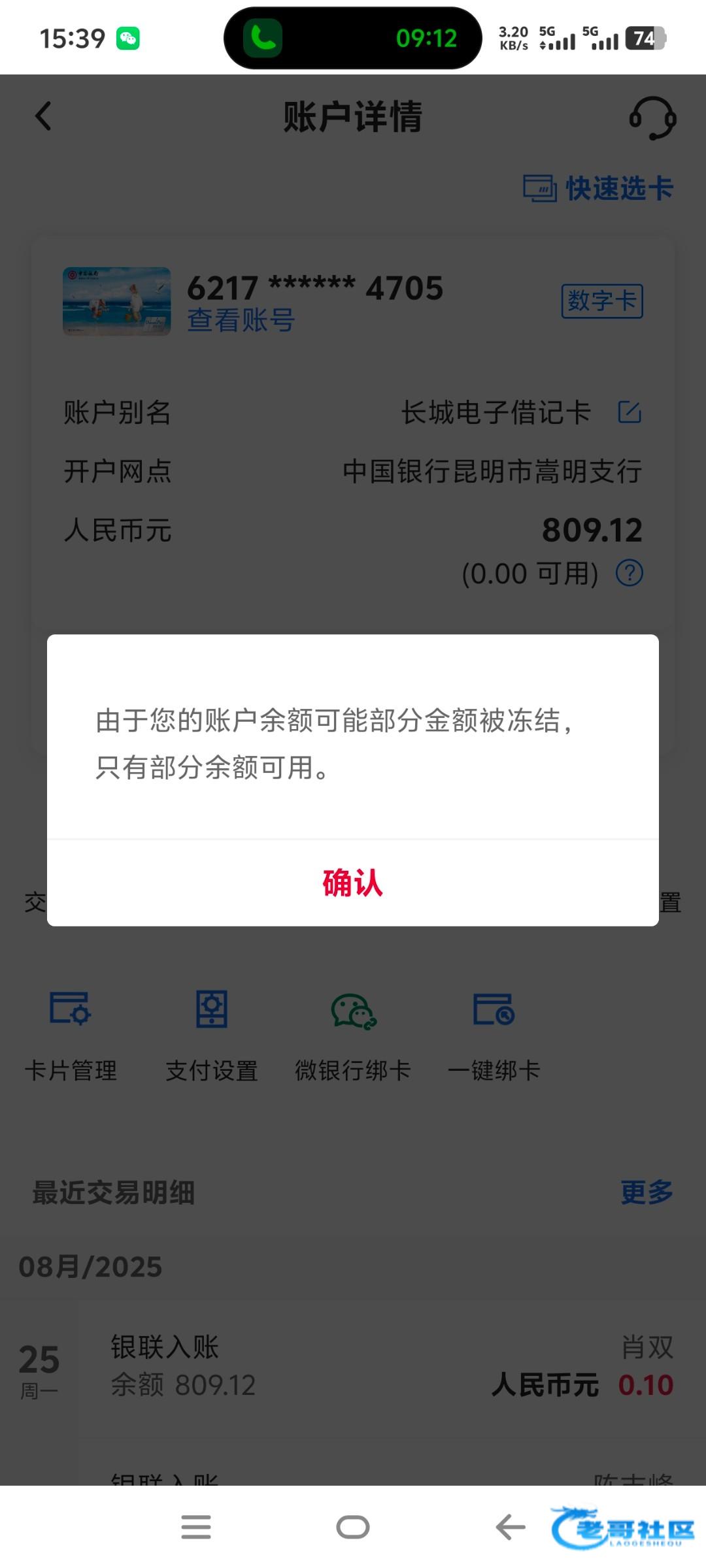 中国银行刚提了一笔就冻结了,支付宝转账的。以前没冻结过,是不是48小时自动解除了
