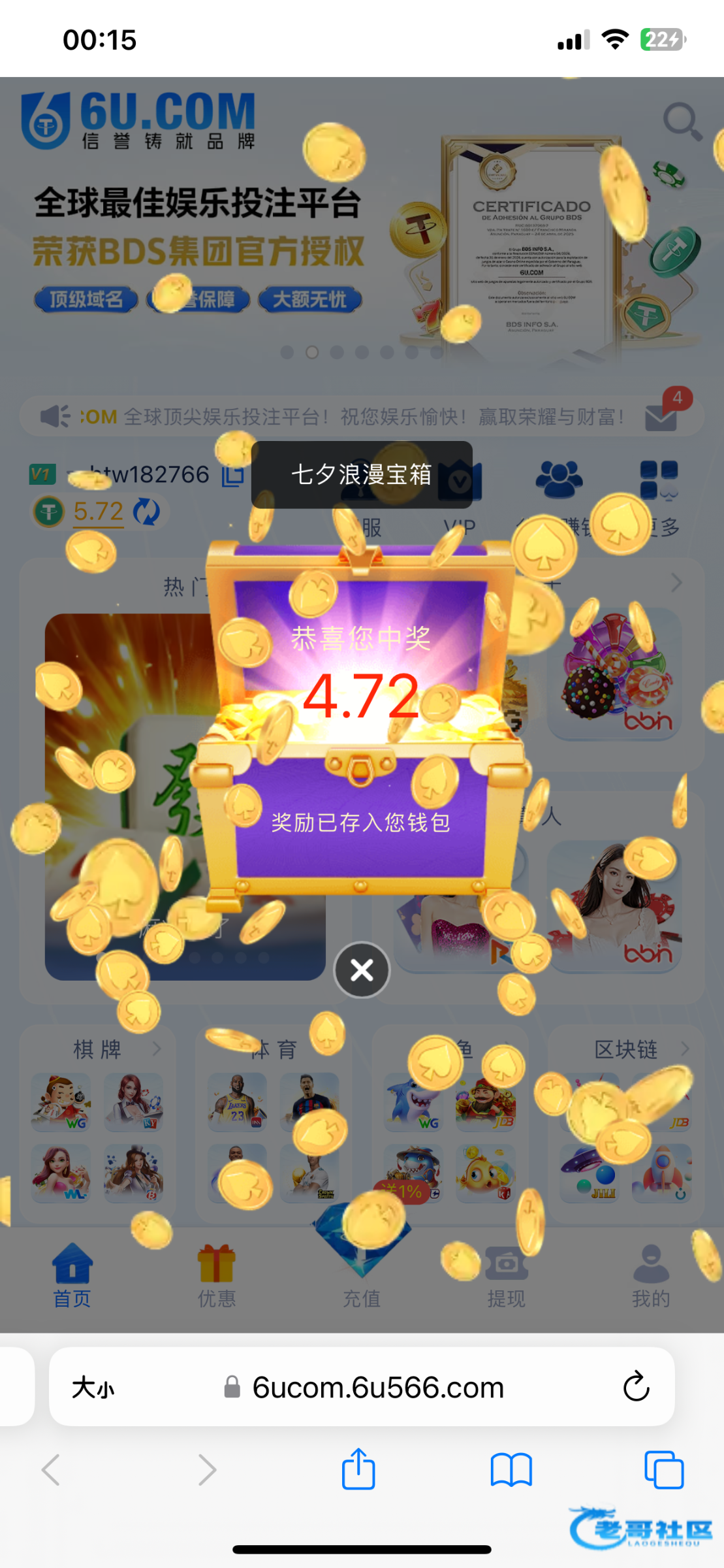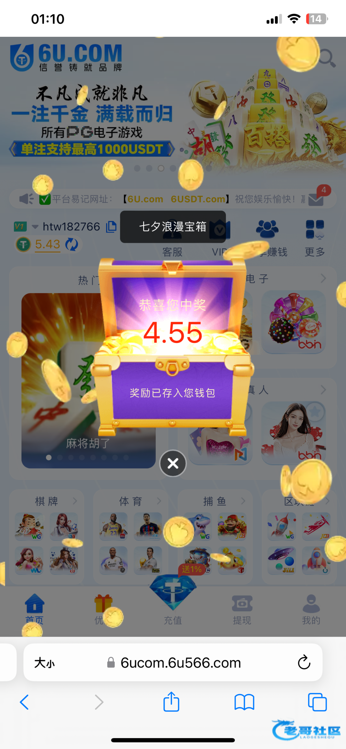 领了一个七夕节宝箱跟红包,打到12u没了
