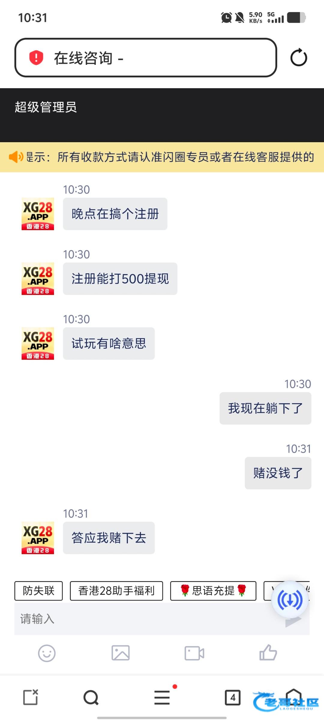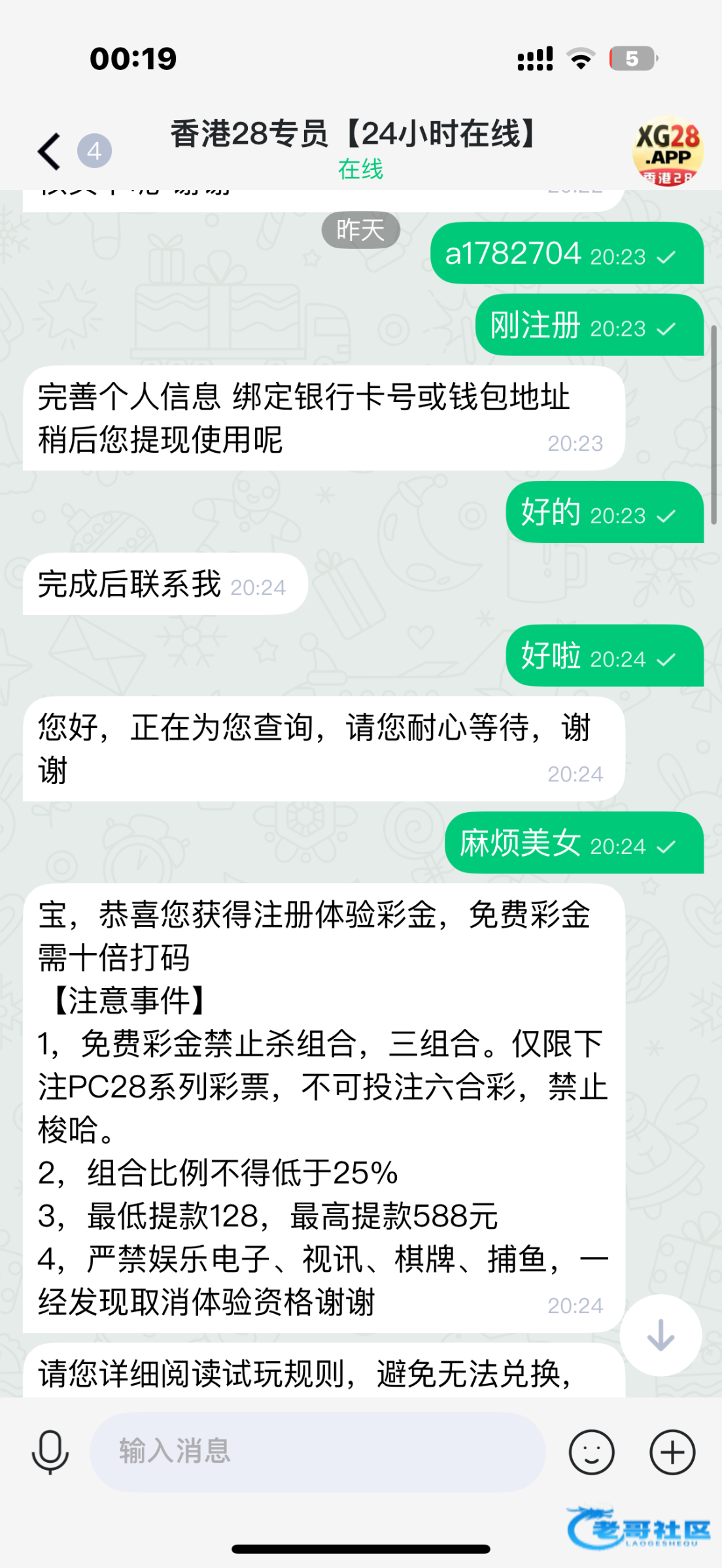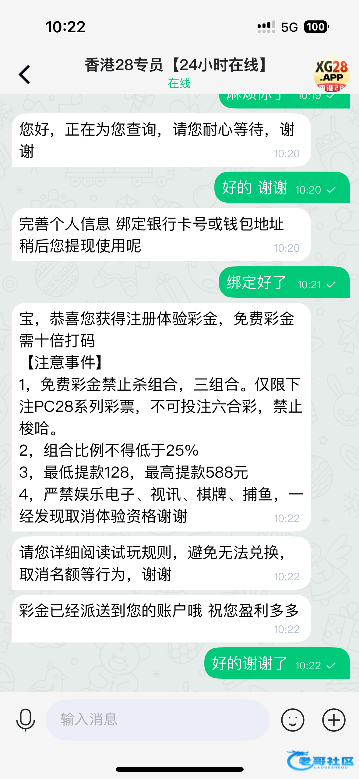 香港28注册送58,注册完绑定出款方式找在线客服说领取注册彩金她会问你哪里来的,就说预测网看到的,然后她会发你一个链接添加专员然后重复上面操作即可,亲测出款300,预测网连接在图中自行复制,望各位老哥得吃,出款给弟弟团一个
