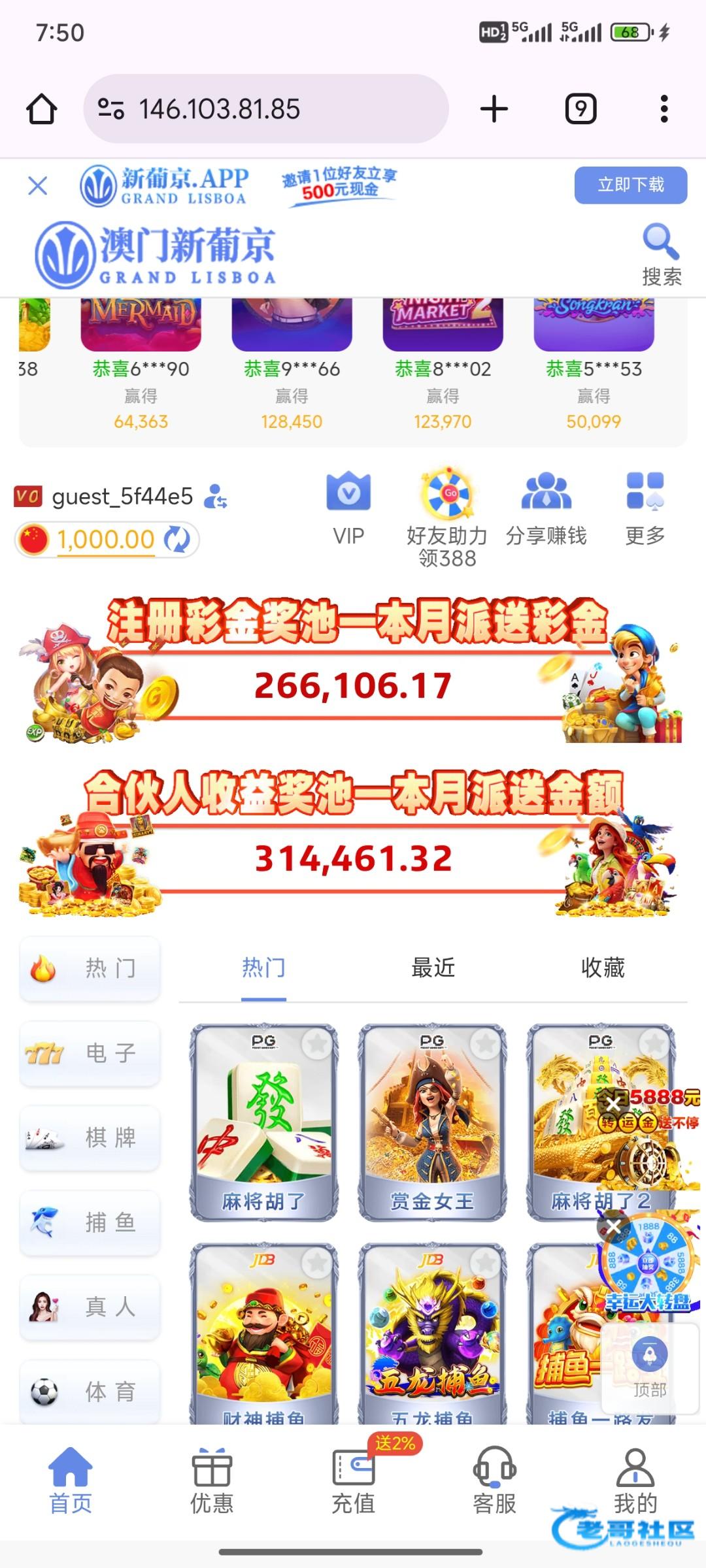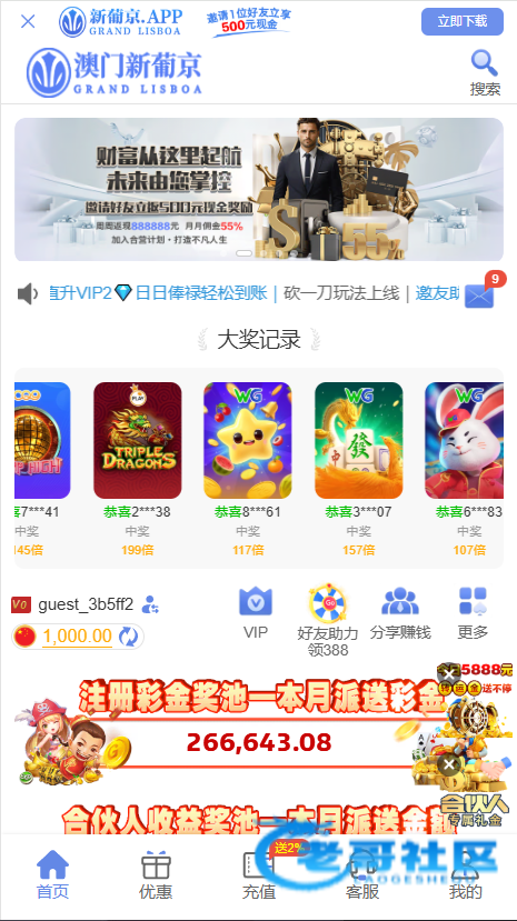 网站:新葡京.app,之前短信特邀注册的,然后充值过100,今天月初无聊登了好几个网站,发现这个网站有18.88,有号的去看一下,还出款了400