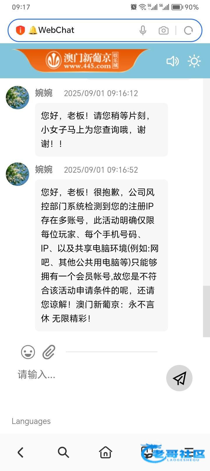 10:06您好,老板!非常抱歉,公司风控部门系统检测到您的注册IP存在多账号,您的IP地址已经申请过该项优惠活动了哦,此活动明确规定每个IP地址仅可以申请一次,故您是不符合活动要求的呢,但不影响用户正常充值下注提款,澳门新葡京·诚信第一品牌,谢谢!
