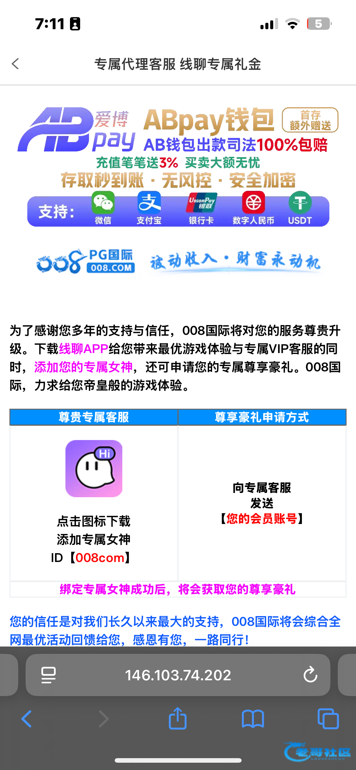 008特邀可以碰瓷 我是打电话来的叫我下载线聊下载了 然后他发我网址我发id就送了网址008.com 打出来好像还有充值 谨慎充值 限制电子棋牌捕鱼