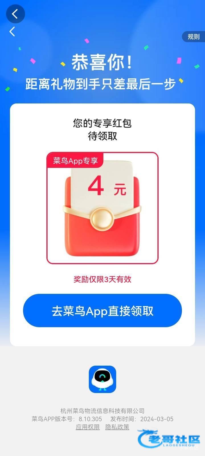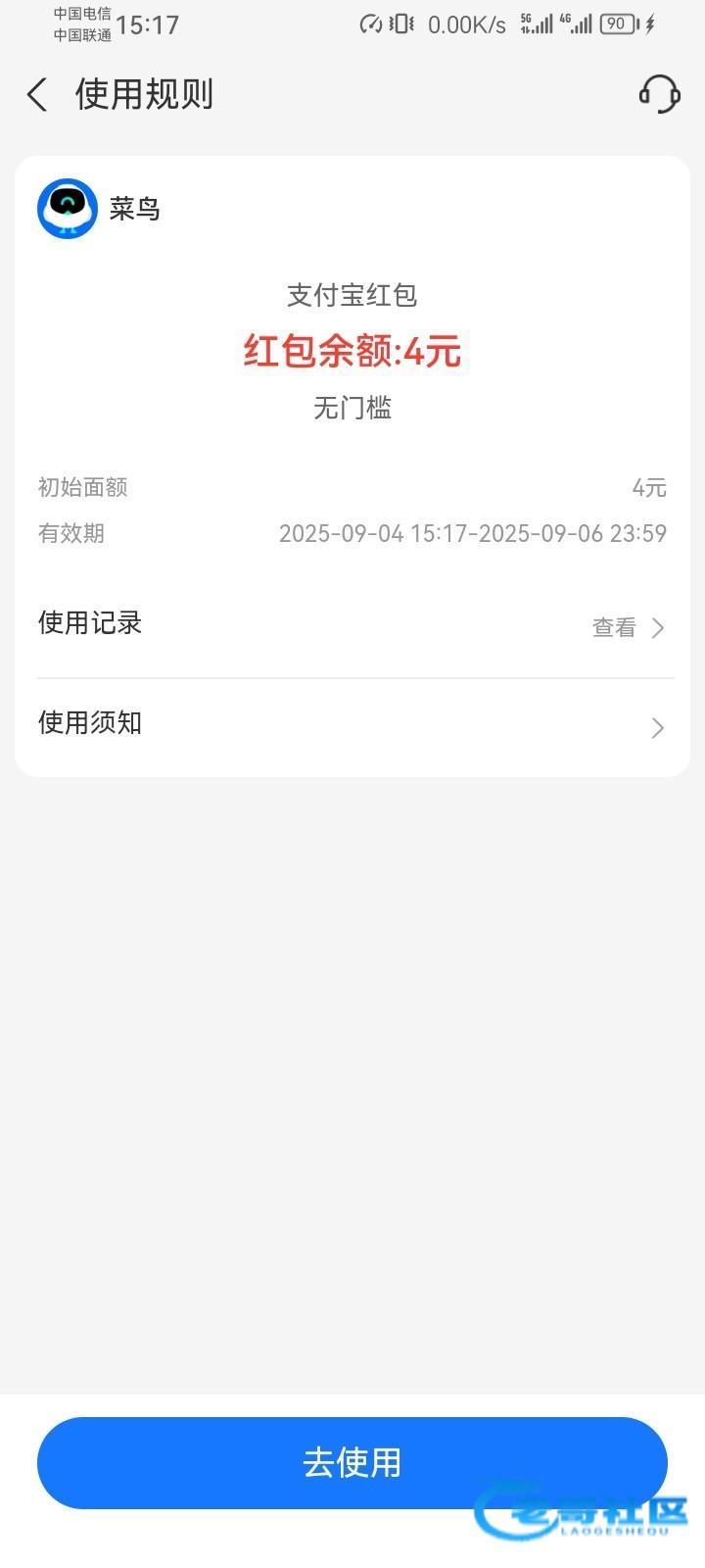 支付宝搜菜鸟,进去有个app新人领4元通用支付红包