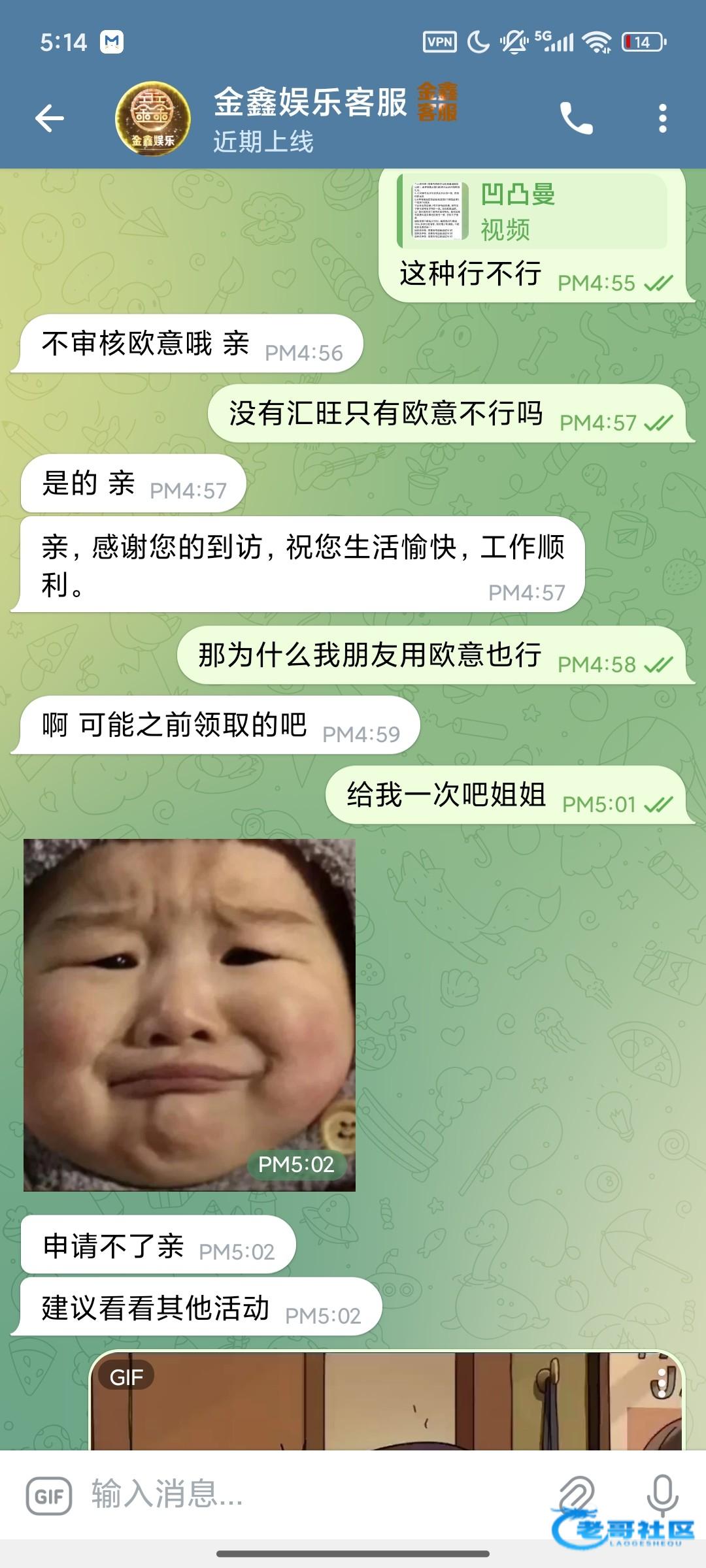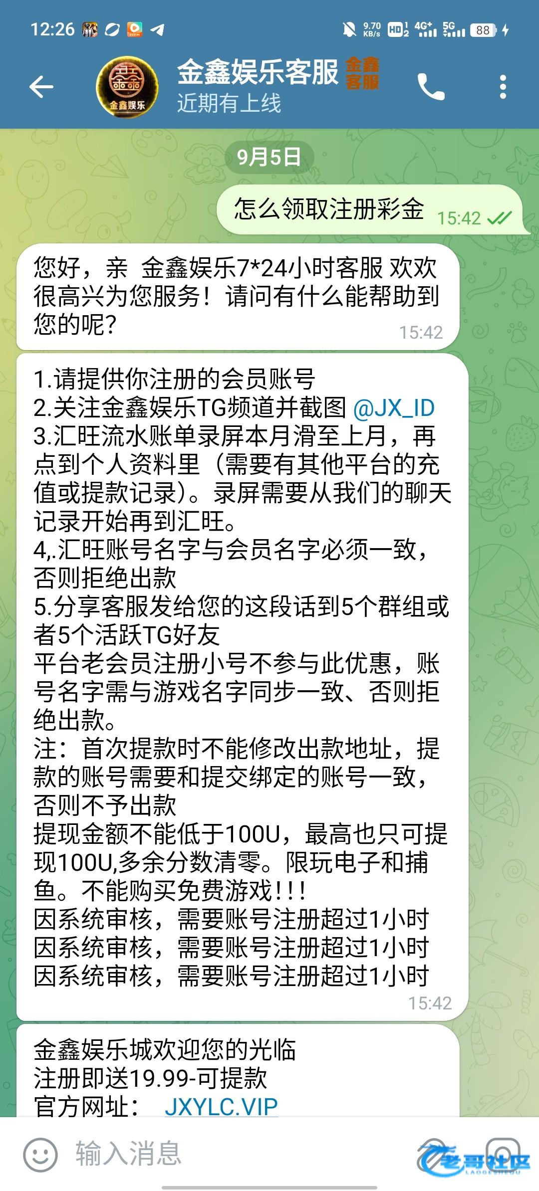金鑫娱乐城联系飞机客服@JXYLCKF,按照客服要求注册,我欧意流水也给了,最高最低100u,我没打出来