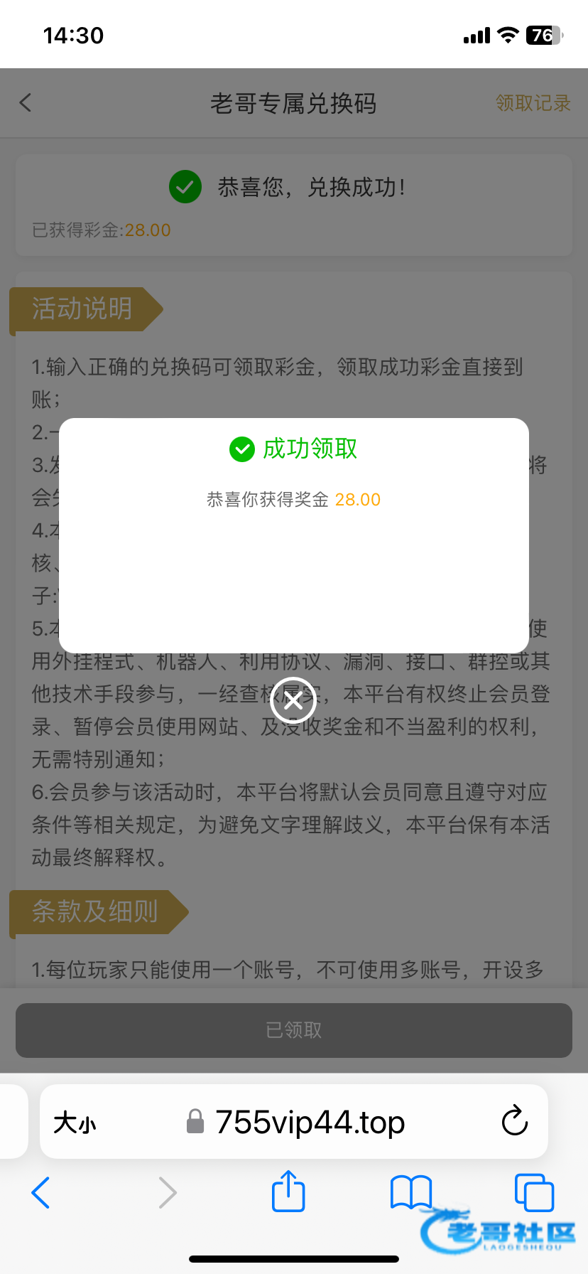 ✅ 代码论坛商城自助领取✅ 论坛签到获取金币,多IP领取会封号✅ 代码在平台活动-新会员-老哥专属彩金兑换⚠️ 使用体验金 → 完成224元有效投注流水✅ 达成后 → 获得最高100元彩金余额✅ 充值88元 → 再完成88元投注