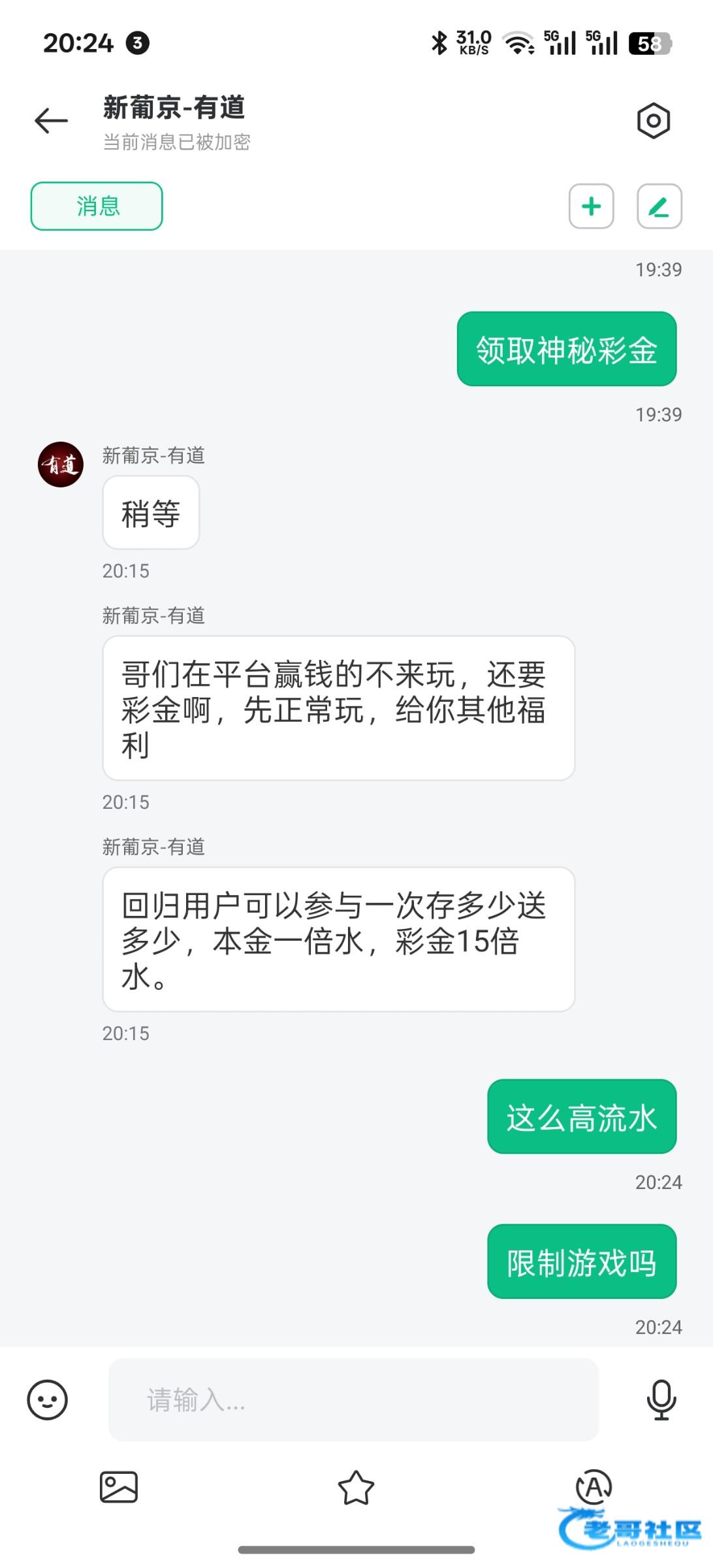 有时候真的不得不服,前几个月打电话送38然后加首存百分百,全挂壁了,等了几个月没回访一次彩金,上个月刚P图然后被查到了,没秒封,这个月就搞这活动,然后登录被封了。真的玩不过狗庄一点。