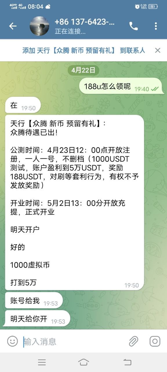 注册体验金1000u,盈利到50000u下分188u