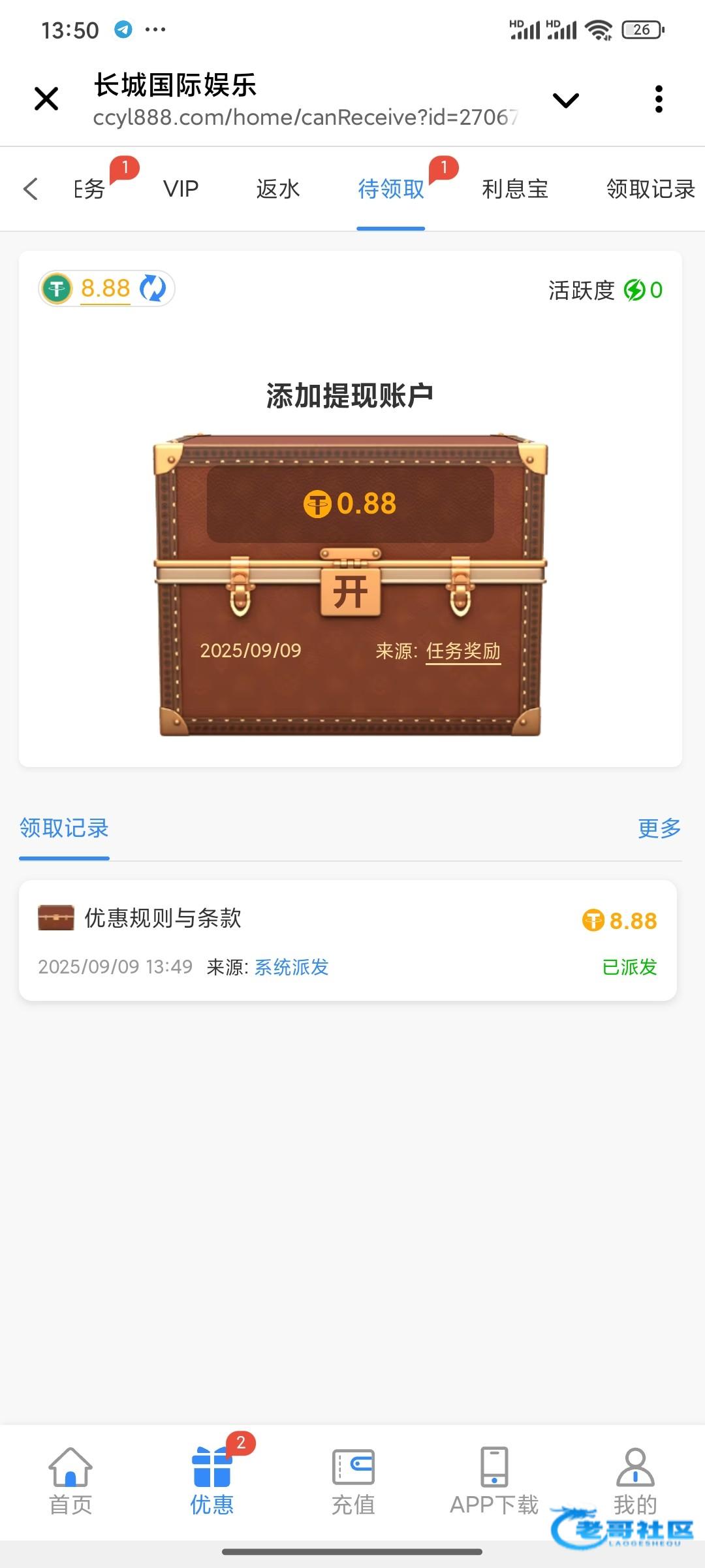 你这个代理不行 前两天私信我 啥资料都不要 直接送了18.88 只要五倍流水 我打到200u出了100u