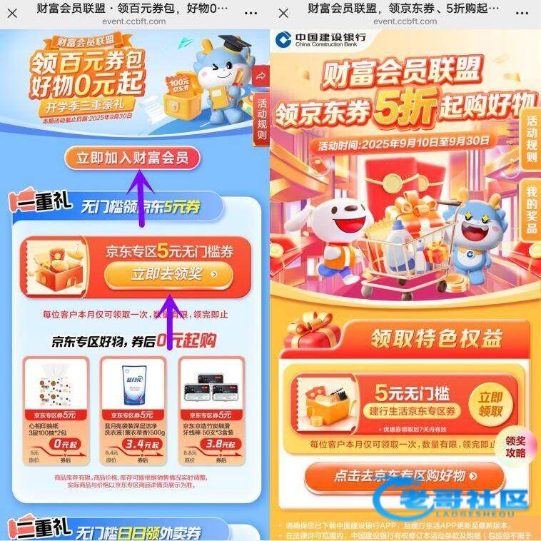 1,先复制链接到微信打开,进去先加入财富会员,然后就可以领5元建行生活京东专区无门槛券:https://event.ccbft.com/ccbact/m385/DP00672508261420CFD4-act.html