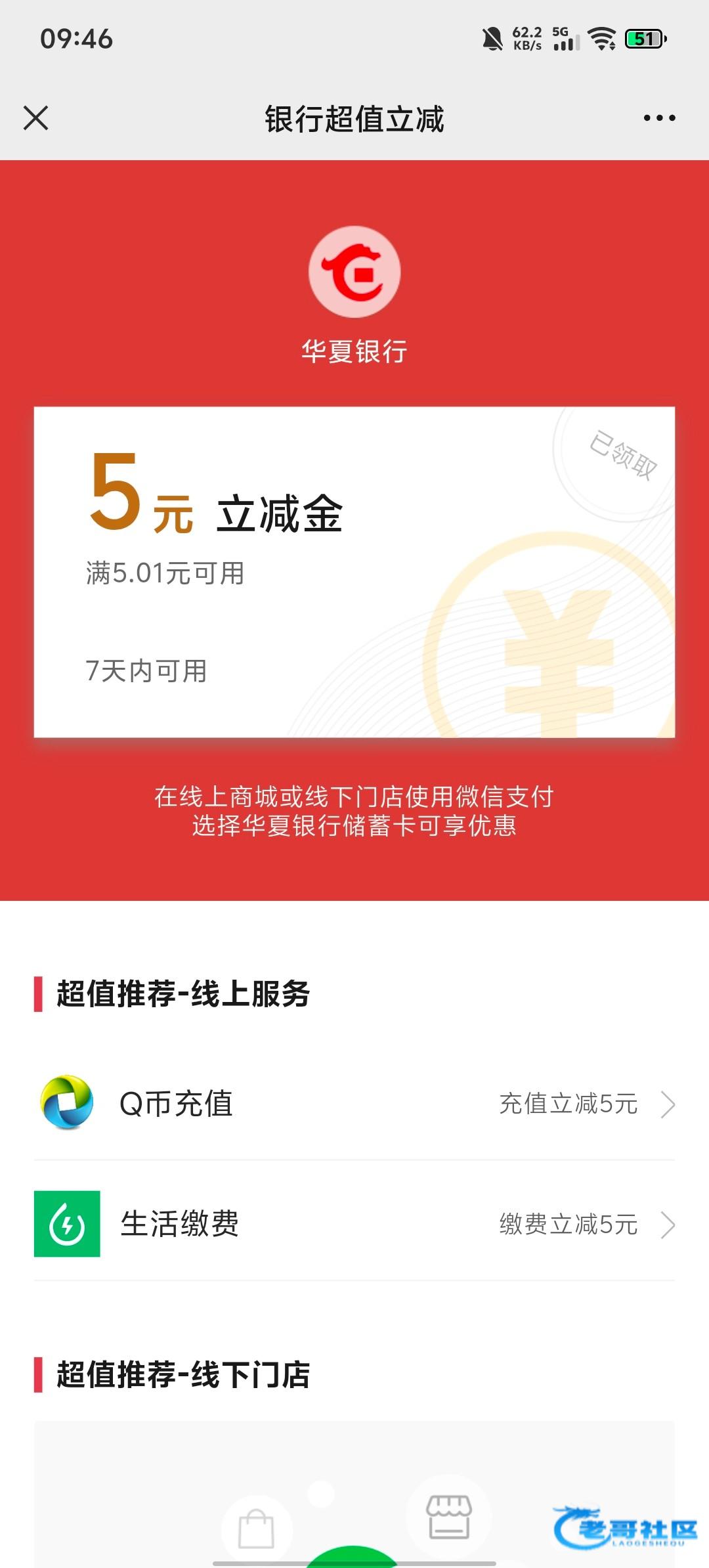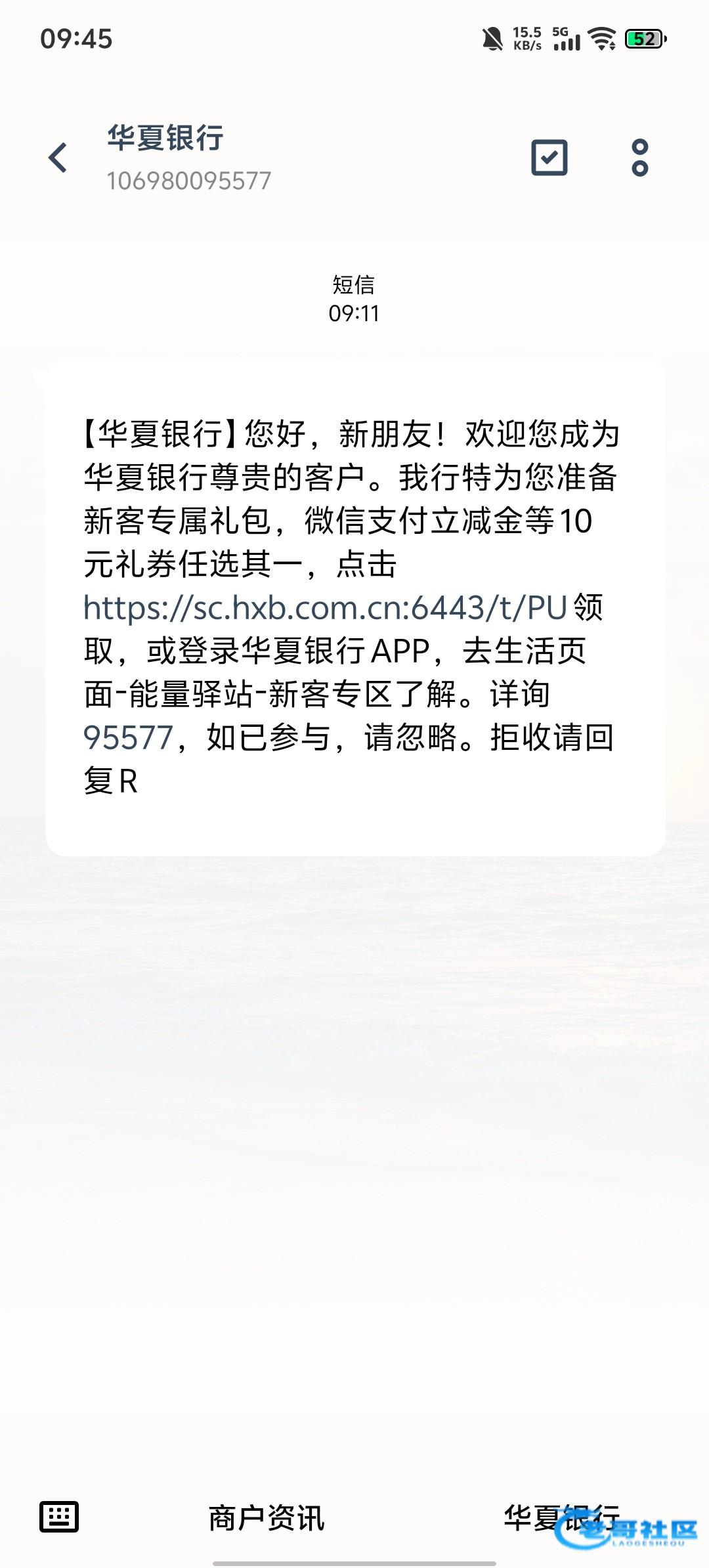 没注册过华夏银行的老哥去试试吧,绑定微信自动送5,领10的链接会自动发短信,没有短信用我这个试试,自动跳转到领取页面https://sc.hxb.com.cn:6443/t/PU