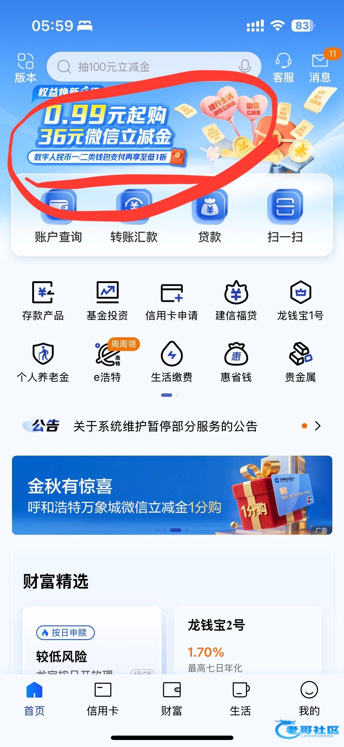 建行app首页上方横幅,抽折扣买立减金,合适的老哥可以试试,我抽到2.99元买到16块立减金,快团团已自撸出来了