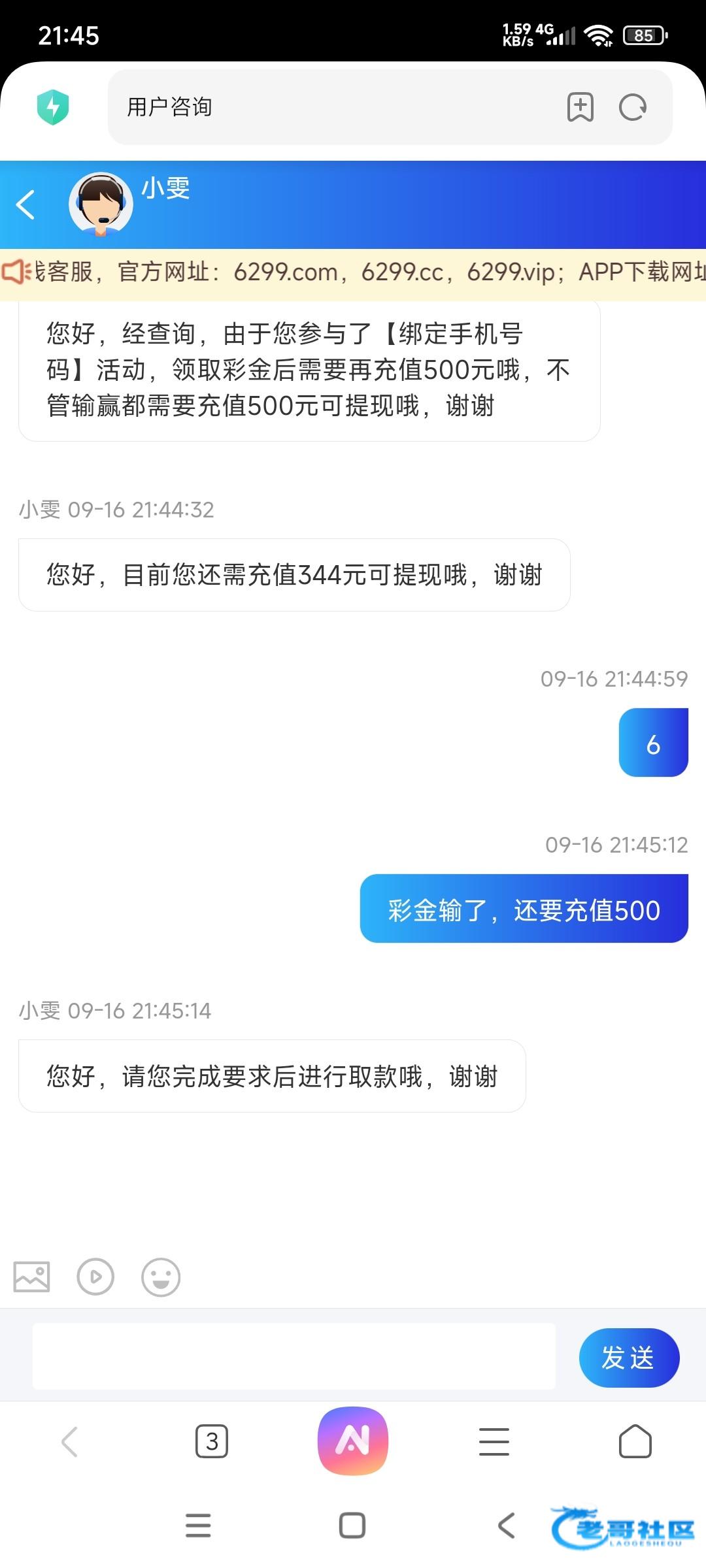 大家看图吧,领那个绑定号码18彩金,输了,要玩的话,后面必须要充500,才可以提现,没充够500不能提现的,你们小心点这个台,还说彩金可以白嫖呢!白高兴,然后打没了,也不想充,这么无理取闹的要求