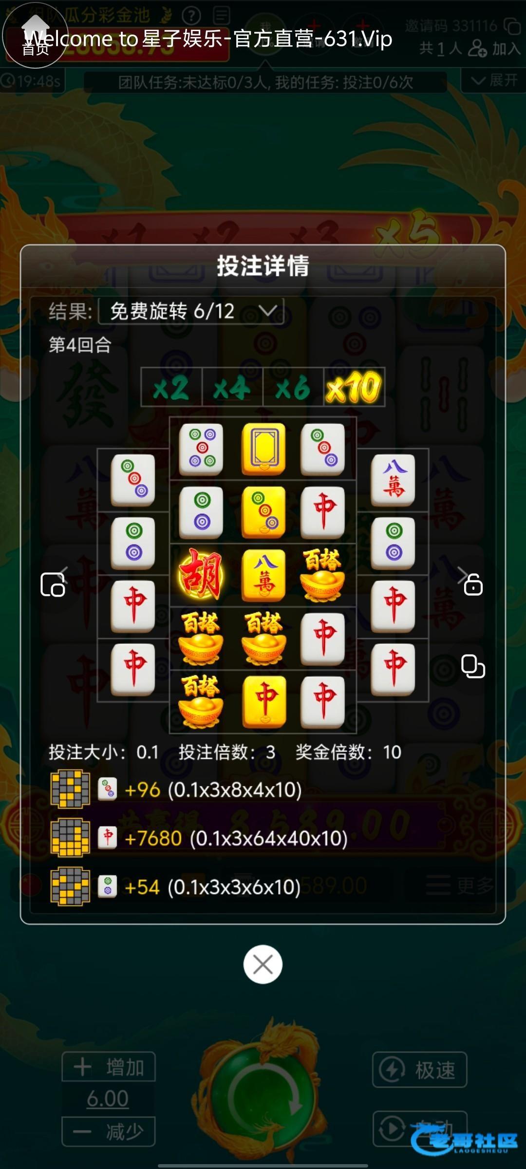 刚发的工资,输了6k,手里就剩500了,我就跑去星子玩了,先冲了300洗白了,然后剩200充值进去,玩的wg的麻2,想着是大点干早点散,就6块一拉,没拉多少手就进免费了,直接爆了快1500倍,只能说牛逼!!