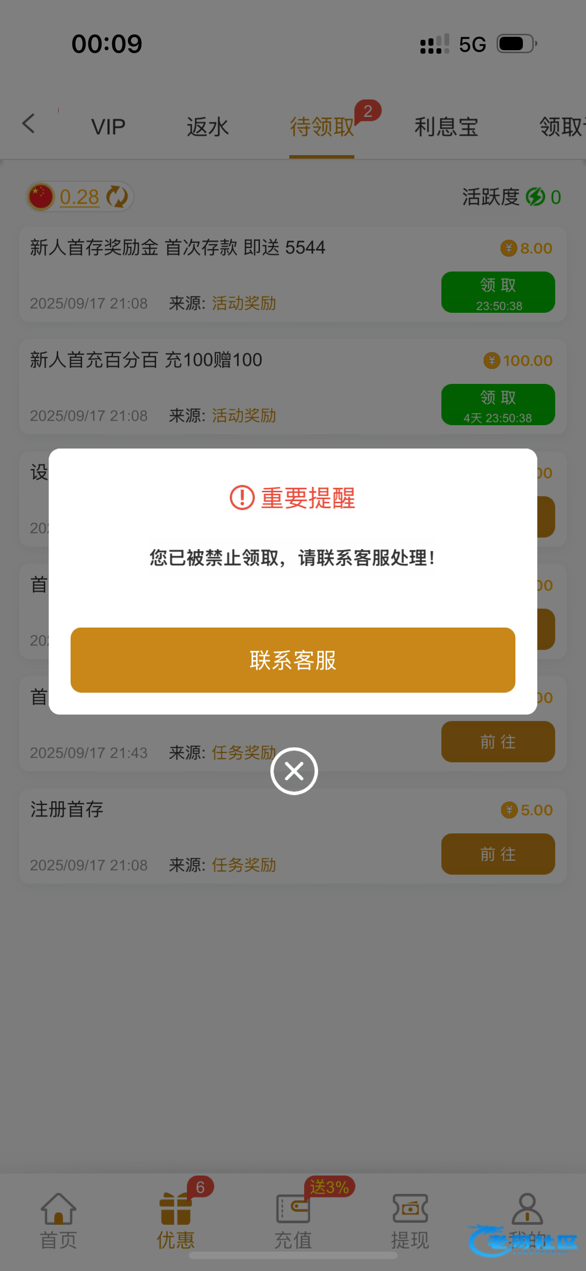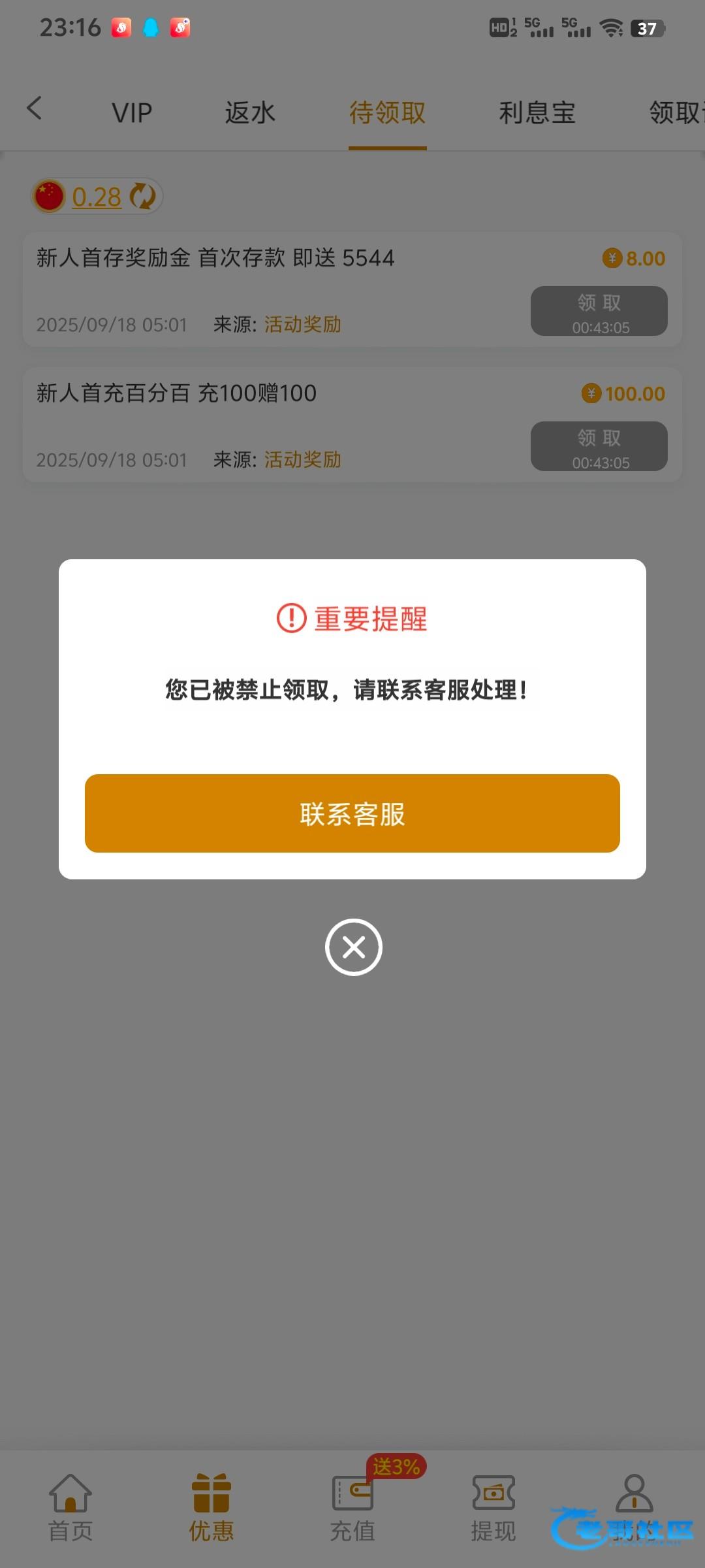 昨天充100要今天才能领100,提了200到了,白天上去看到封号了,白天去找客服说想充值玩怎么打我号封了,后面给我解了,可以去试一下,不一定行,刚刚去领了108块打出来200,如果可以解不要领那8块,太坑了,8块要打224流水