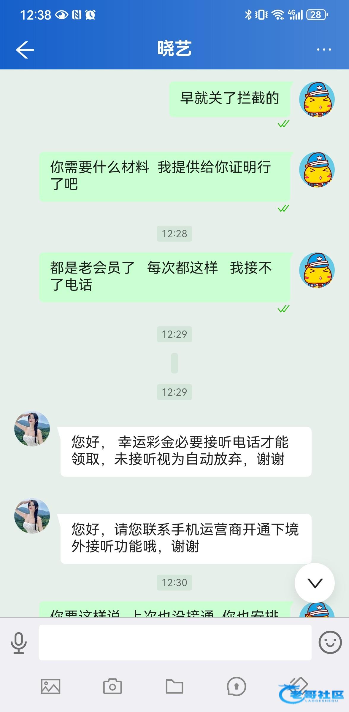 每次来这个幸运彩金都痛苦 ,领取必须要接电话核实,但是我手机不知道为什么接不到境外电话了,他们打过来就是无法拨通,换手机也不行,扯皮扯半天,好歹也有一百多不要又可惜,有老哥能解决接不到境外电话的困扰吗