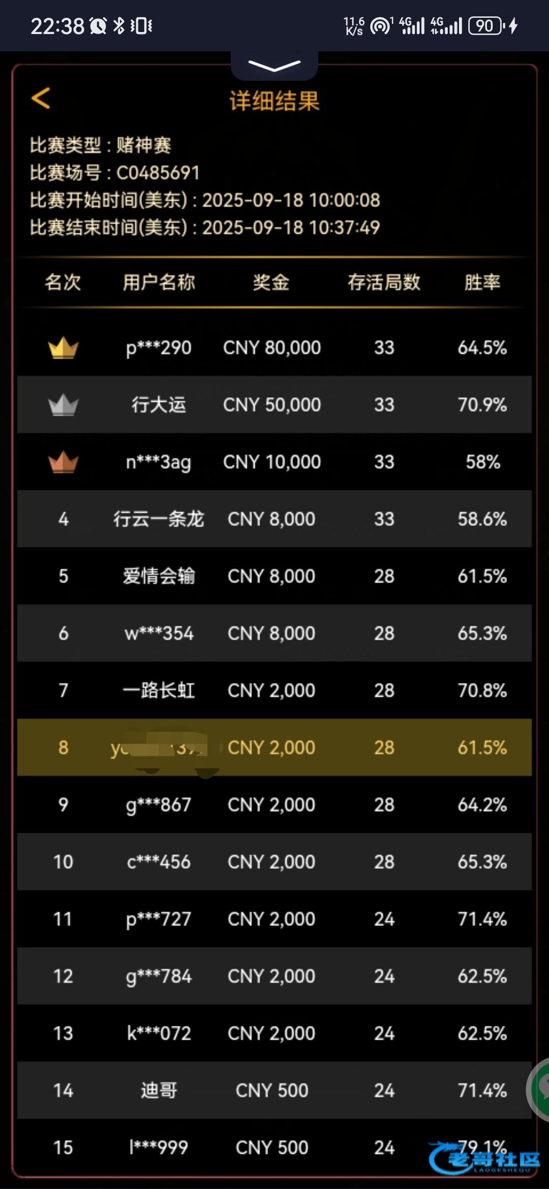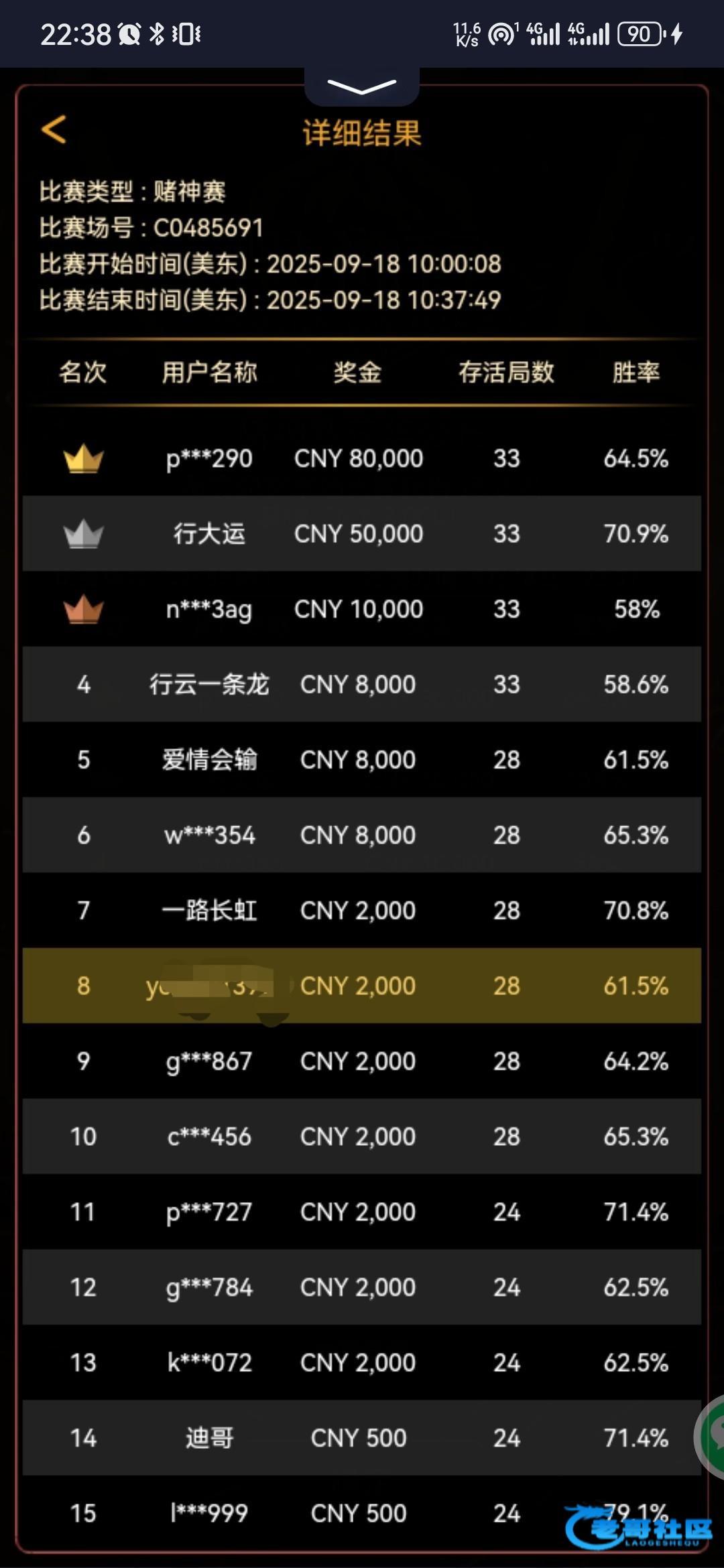 吗的 最后8进4的时候 连开两个和局 导致没发追分 没有追到本桌前两名 太可惜了 第8跟前6奖金差太了!!!!!!!!