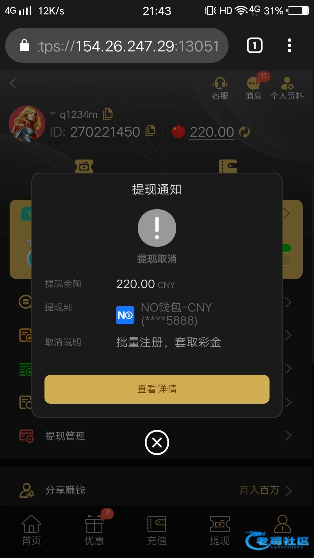 刚才给我打电话来说送22 前面麻将爆了160多 0.6的注 后面流水够了快不行了 直接麻将2块钱一拉 进了3次免费后够了220 提了几分钟到账了 舒服
