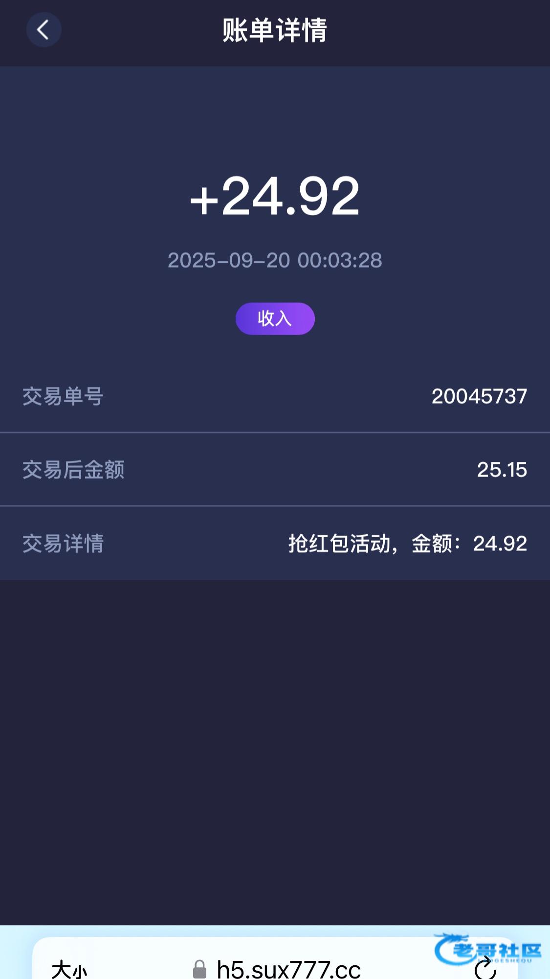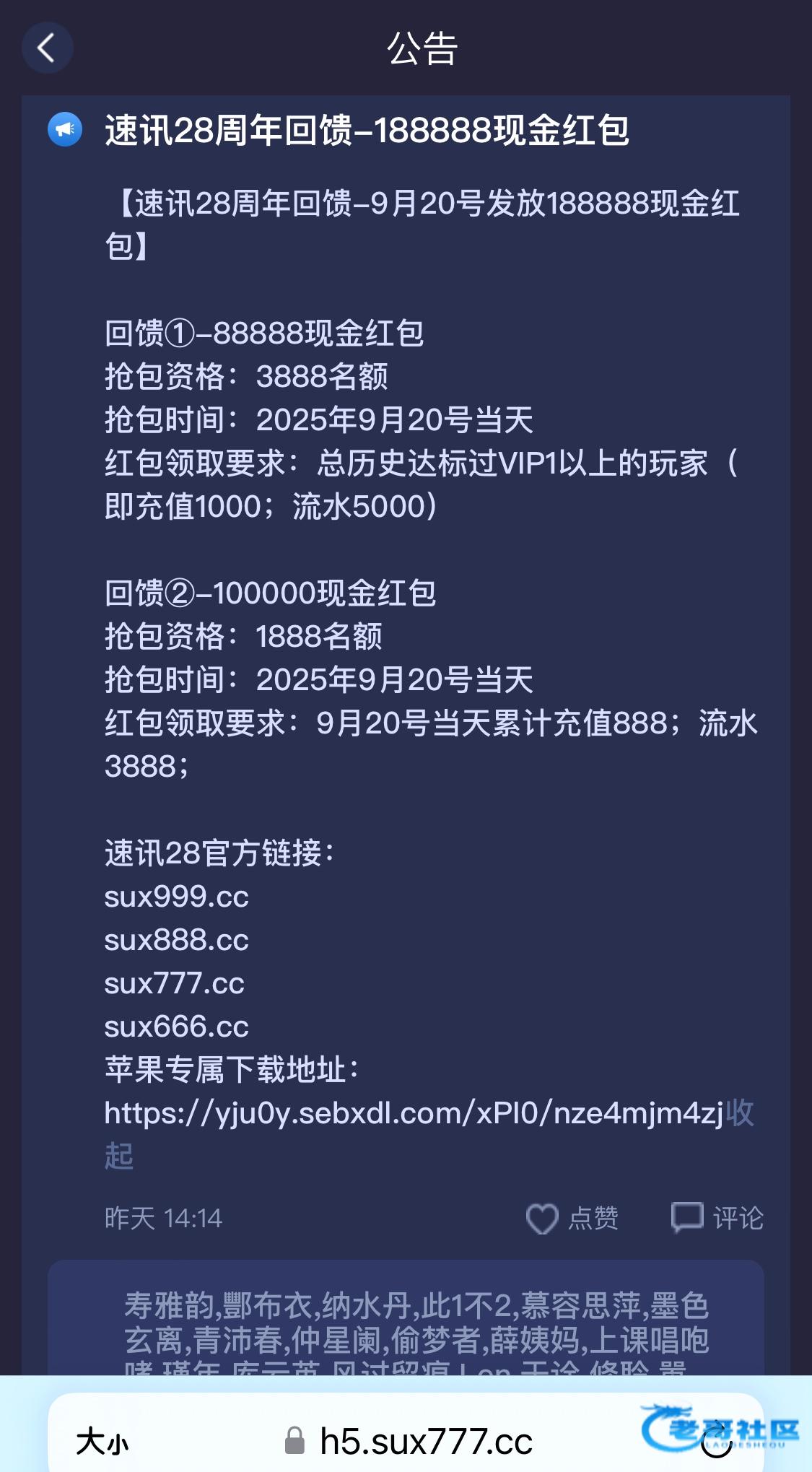 速讯28等级vip1以上的,可以领取一个红包,名额有限,速度去。看清楚要求再去 网址 sux777.cc