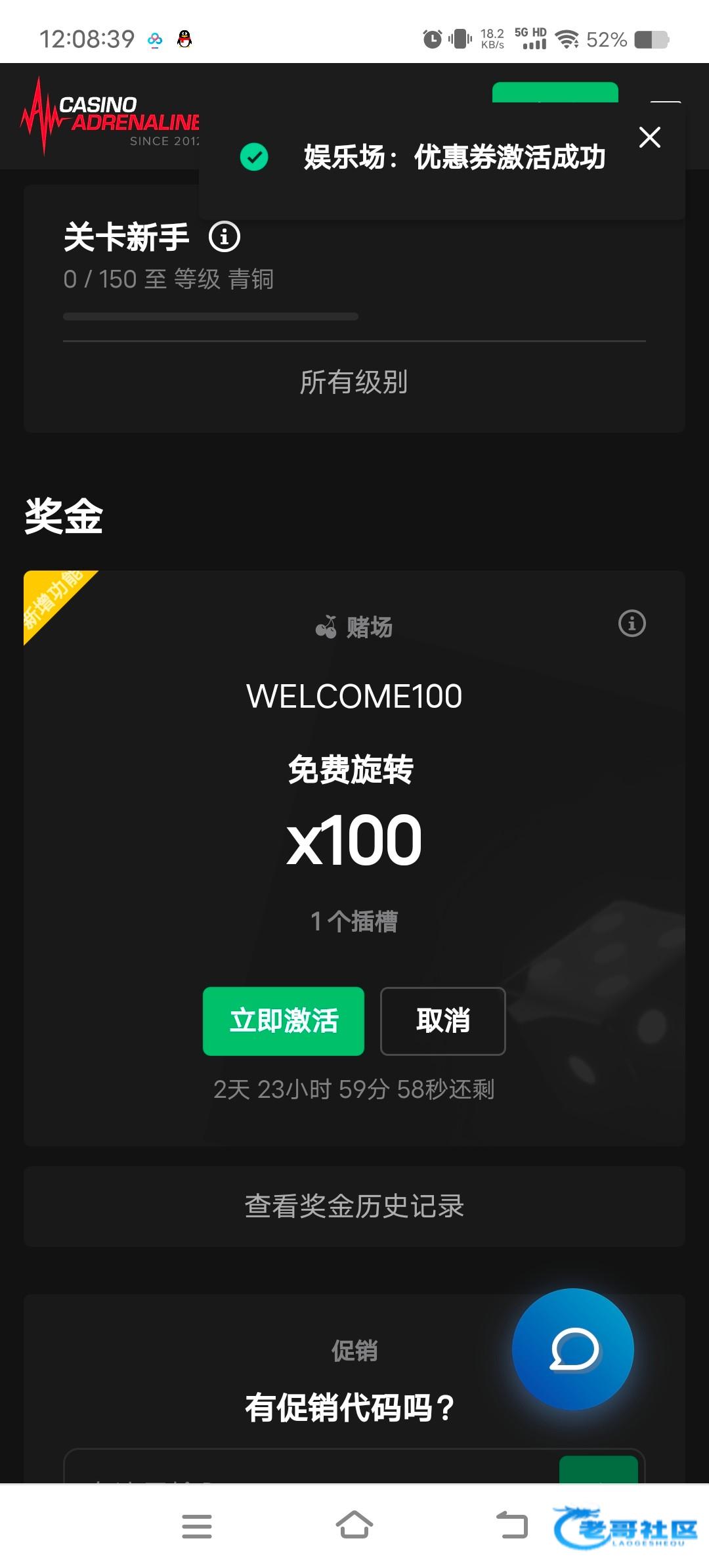 邮箱注册,选择美元,注册后会发邮件,要去邮箱验证,促销里输入兑换码WELCOME100,免费旋转转完需要打40倍流水,提现自测。看不懂的去翻译中文。网址https://www.casinoadrenaline.com/profile/promo/casino