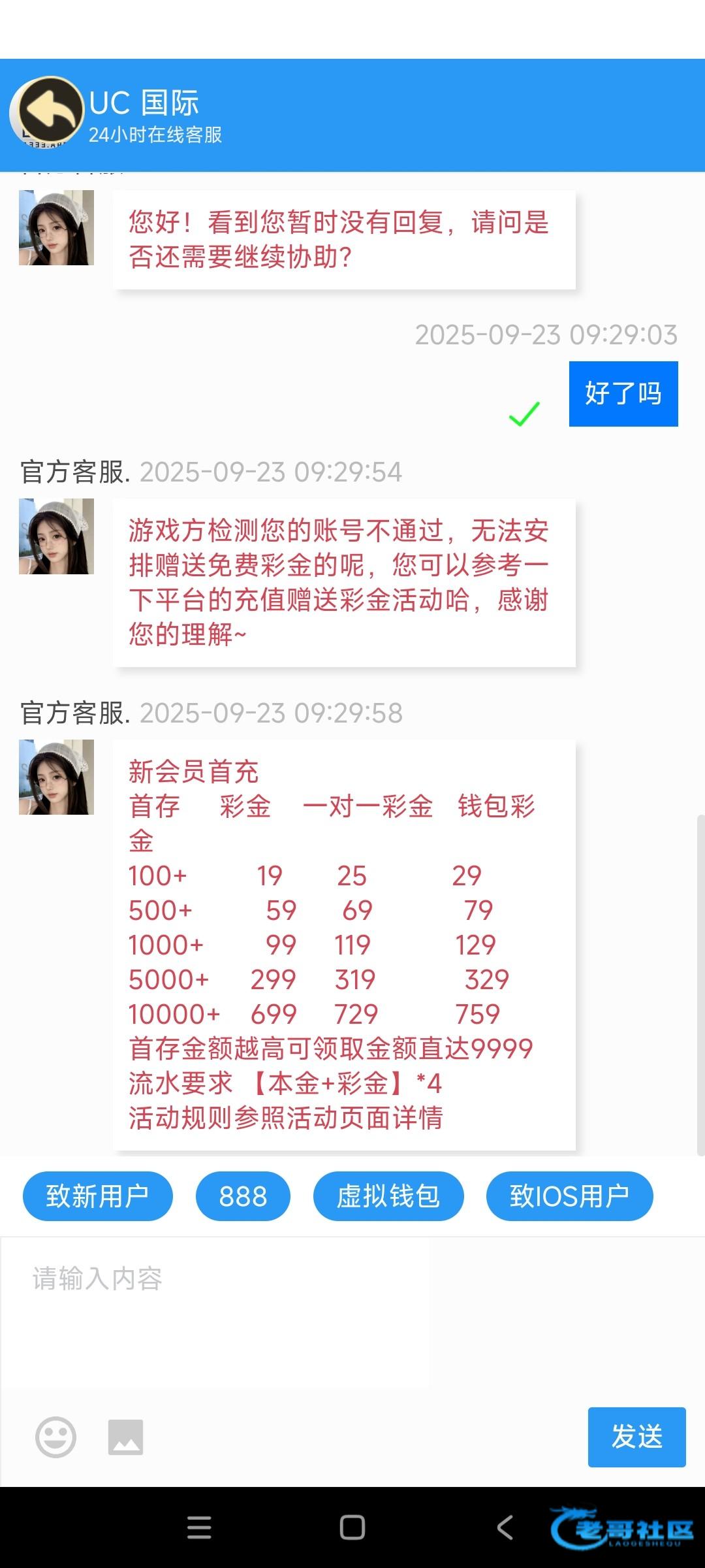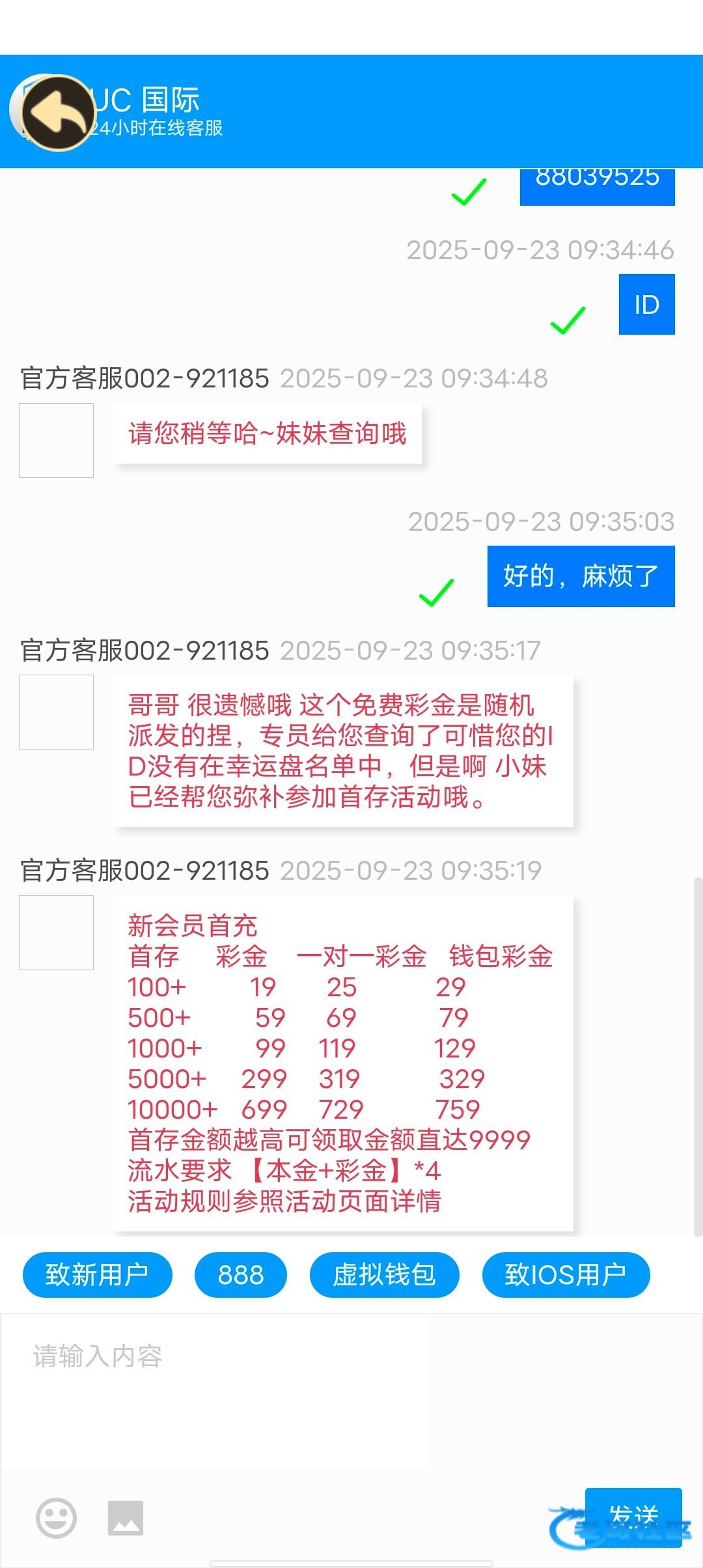 哥哥 很遗憾哦 这个免费彩金是随机派发的捏,专员给您查询了可惜您的ID没有在幸运盘名单中,但是啊 小妹已经帮您弥补参加首存活动哦。