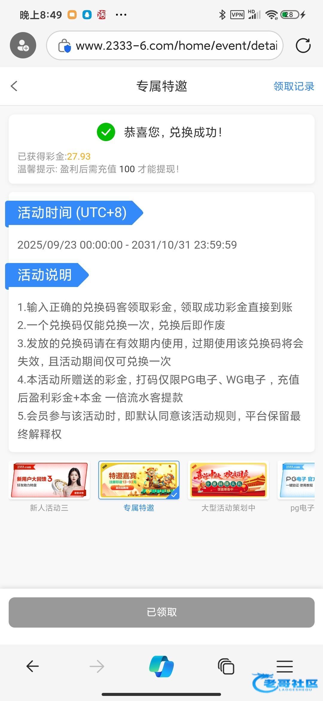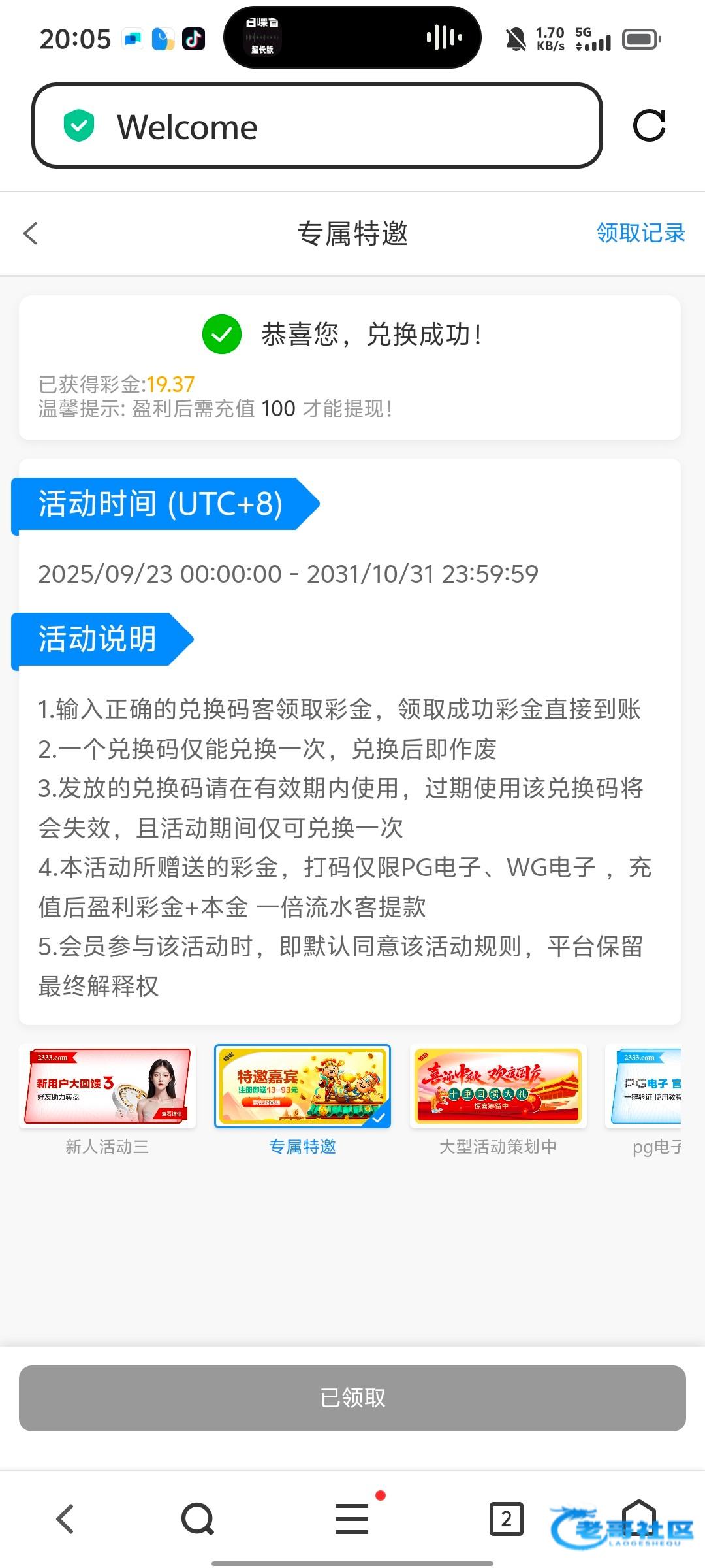 彩金代码仅限新用户领取,也就是当日注册的用户,领到彩金代码后到平台活动,专属特邀里面输入代码兑换,彩金代码是随机13-93金额只能玩WG PG 其他游戏娱乐盈利扣除,彩金代码打到288后再去充值100打一水就可以全部提不限制游戏