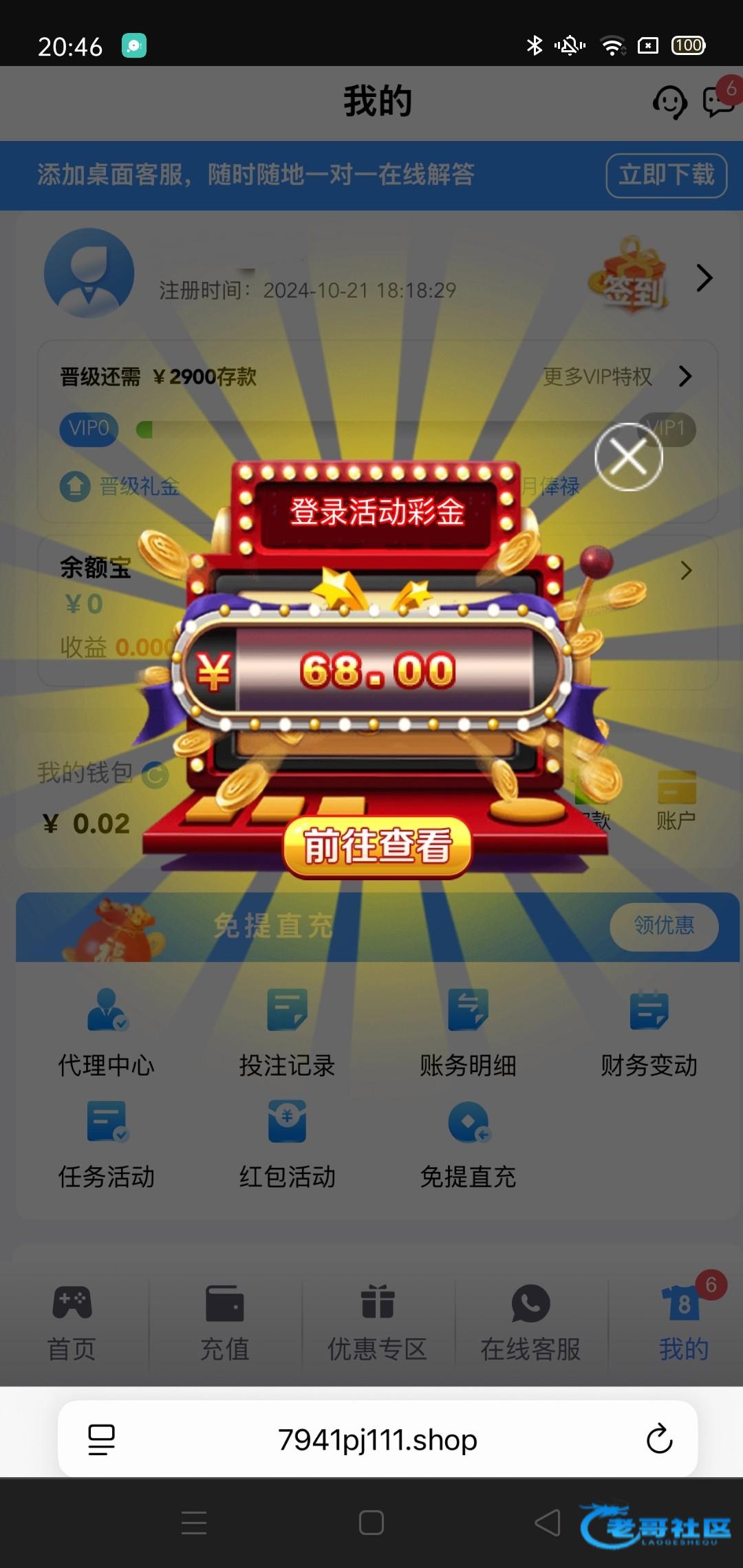7941.com 冲过100登录给了68也没接到电话也没短信,不知道啥彩金