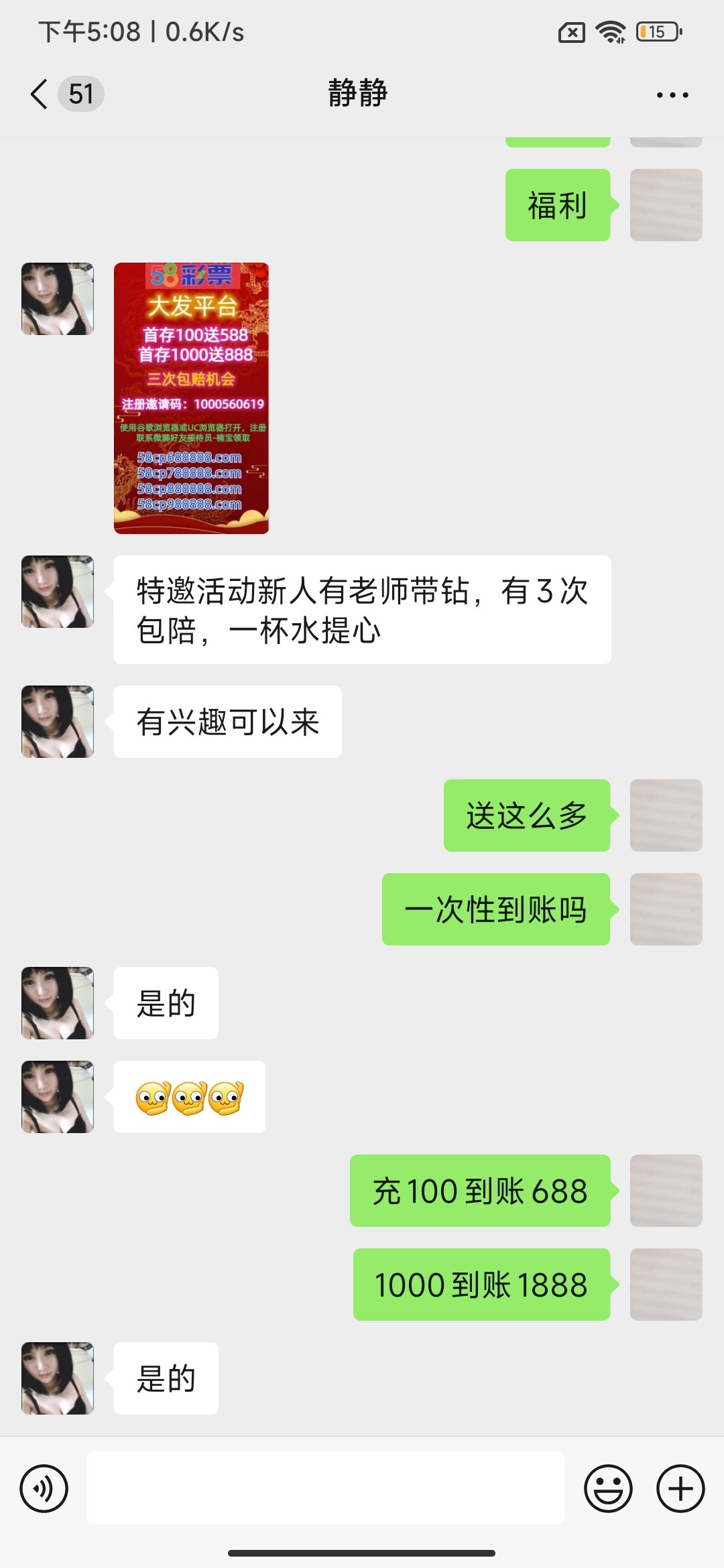 前天泡泡一个傻吊客服 之前是找她领彩金 说我不符合没送 然后又给我发信息充100送1888 一次送到一杯水的 傻子都知道是骗子哈哈哈