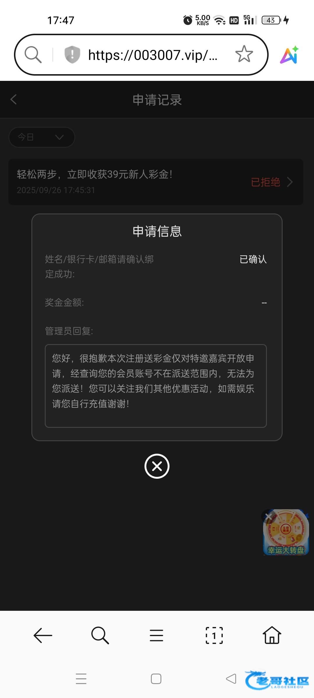 您好,很抱歉本次注册送彩金仅对特邀嘉宾开放申请,经查询您的会员账号不在派送范围内,无法为您派送!您可以关注我们其他优惠活动,如需娱乐请您自行充值谢谢!