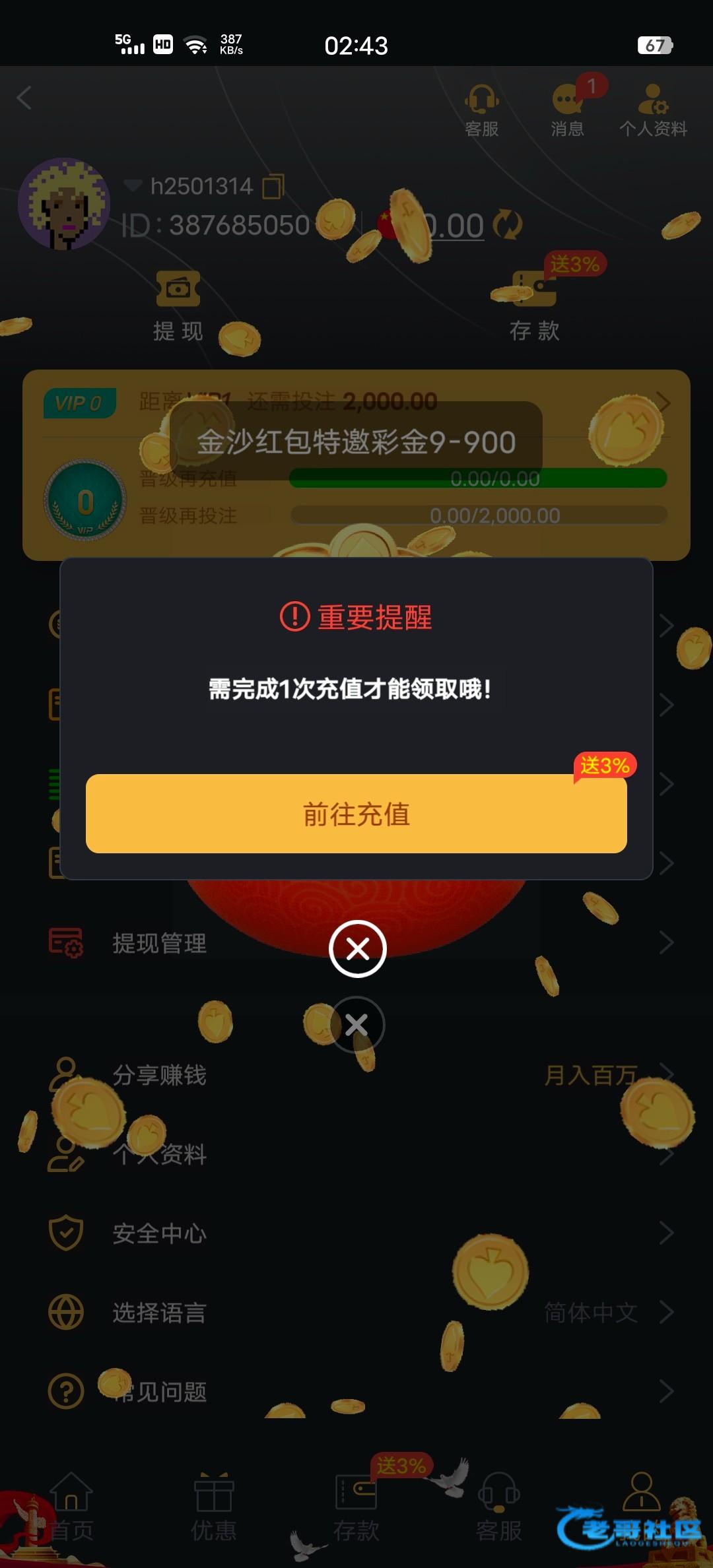 垃圾平台,打电话特邀,领取要首充,首充之后再领就不是特邀了