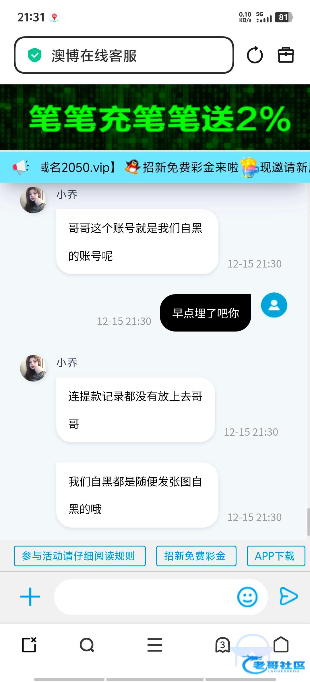 电话说特邀充值100送100两倍流水,结果充值了之后找在线客服,说是要8倍流水,不要这个活动自己玩结果够了一倍流水不给提现账号直接冻结黑台