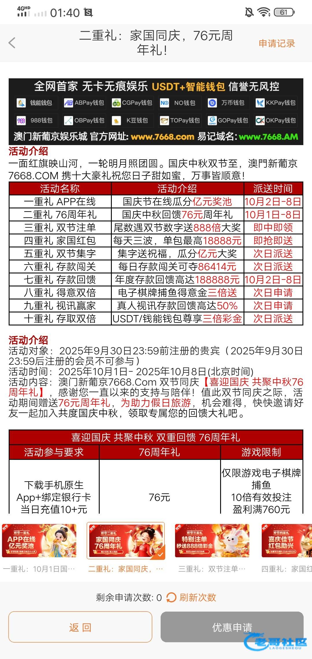 统一回复:用谷歌浏览器 打不开地址就重新加载就可以了 7668.com.cc都行然后申请没次数的退出登录再进刷新或者等一下刷新就有了