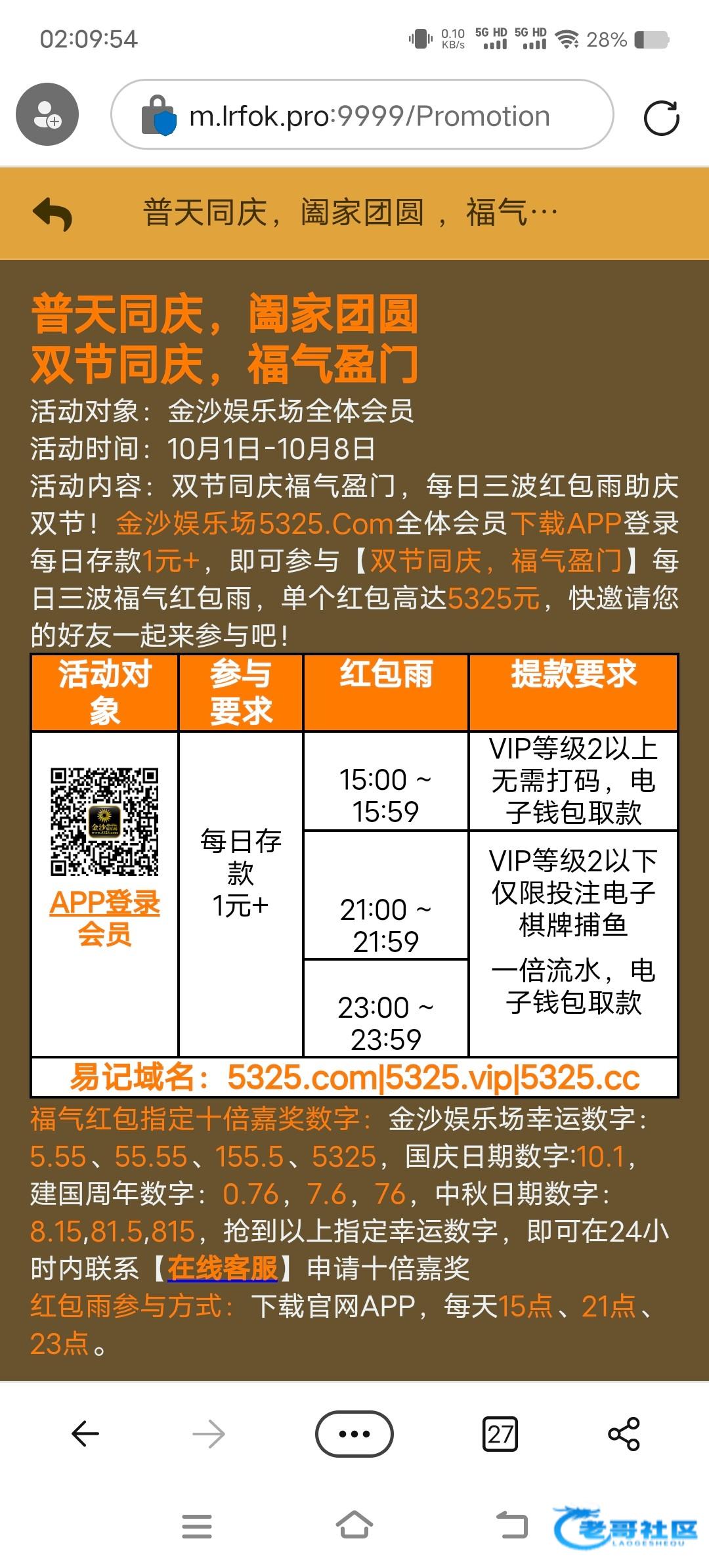 有玩过的去,下午派送国庆vip彩金,还有抢红包活动,抢到了尾数联系客服申请十倍加赠。网址 5325.cc