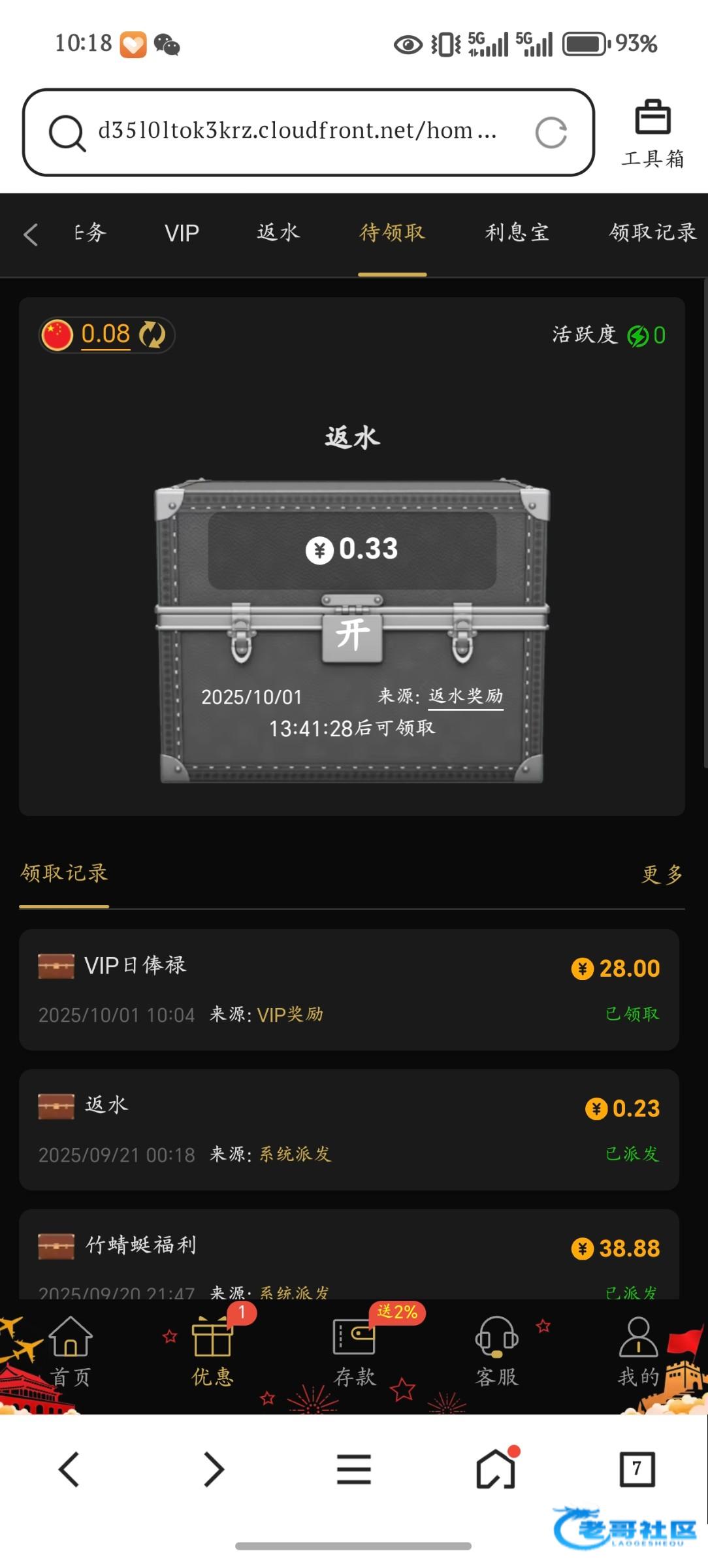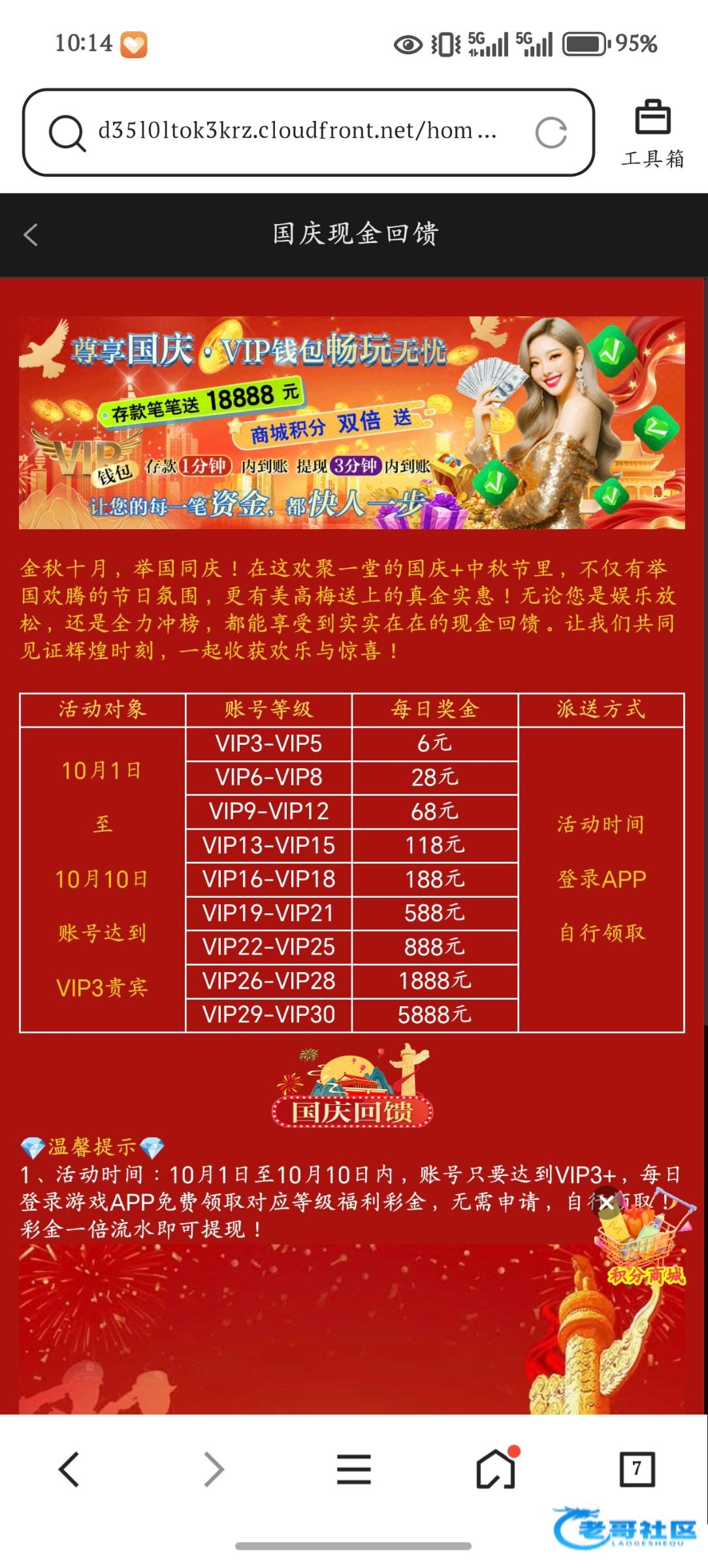 都去看看吧,我当时是一注册就VIP6,现在VIP7了,国庆这10天每天都能领28,没什么限制,一倍流水就行网址51.app