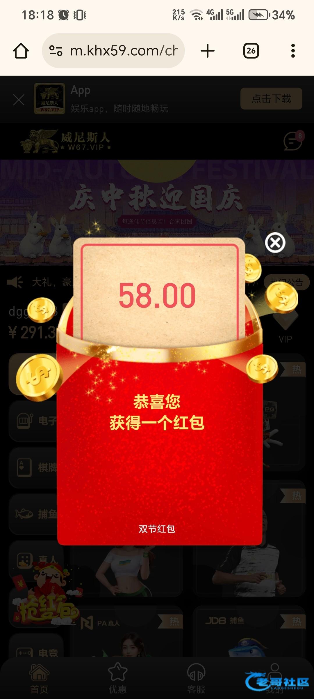 送了58,估计要充值过的,这台半黑,w67.vip