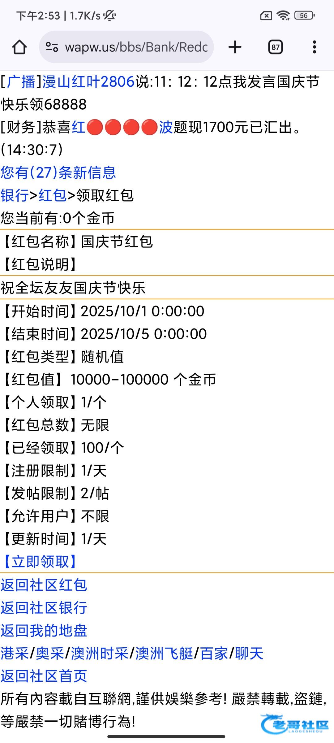 10.1-10.5富甲也能抢红包 到五号 我不会发帖链接https://wapw.us/bbs