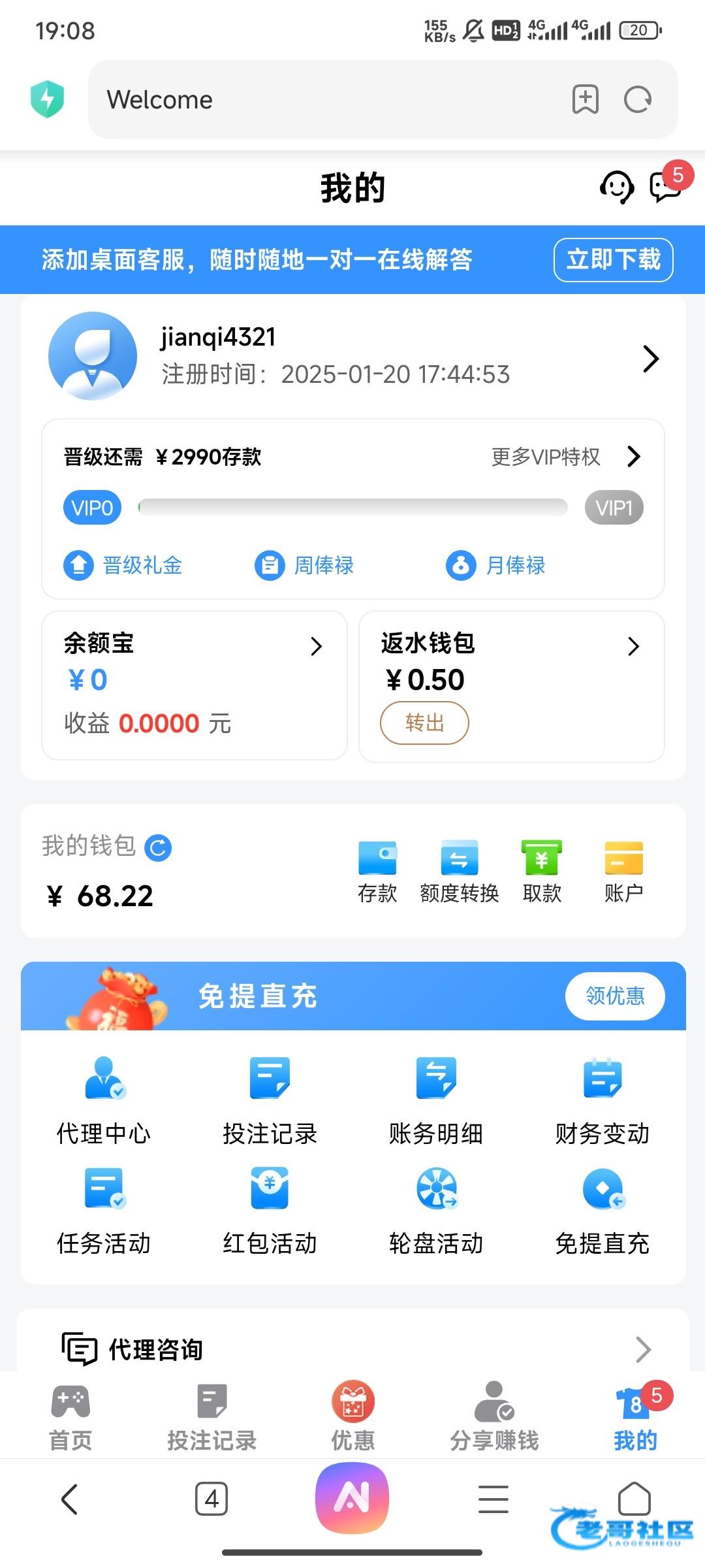 试了一下没号,注册了一个,看到下载APP送18,下载完去申请,说没名额了,跟我说去充值100,申请首存彩金,然后我就充了,结果他说我都IP又没申请到,然后裸打到200提现,又给我退回了,让我提银行卡,然后去提银行卡显示最低提现300,又打了打电子,打到150去彩票梭哈了一把到300,又提了又给我退回,说农行不支持,又换了张卡,终于提现成功了,妈的