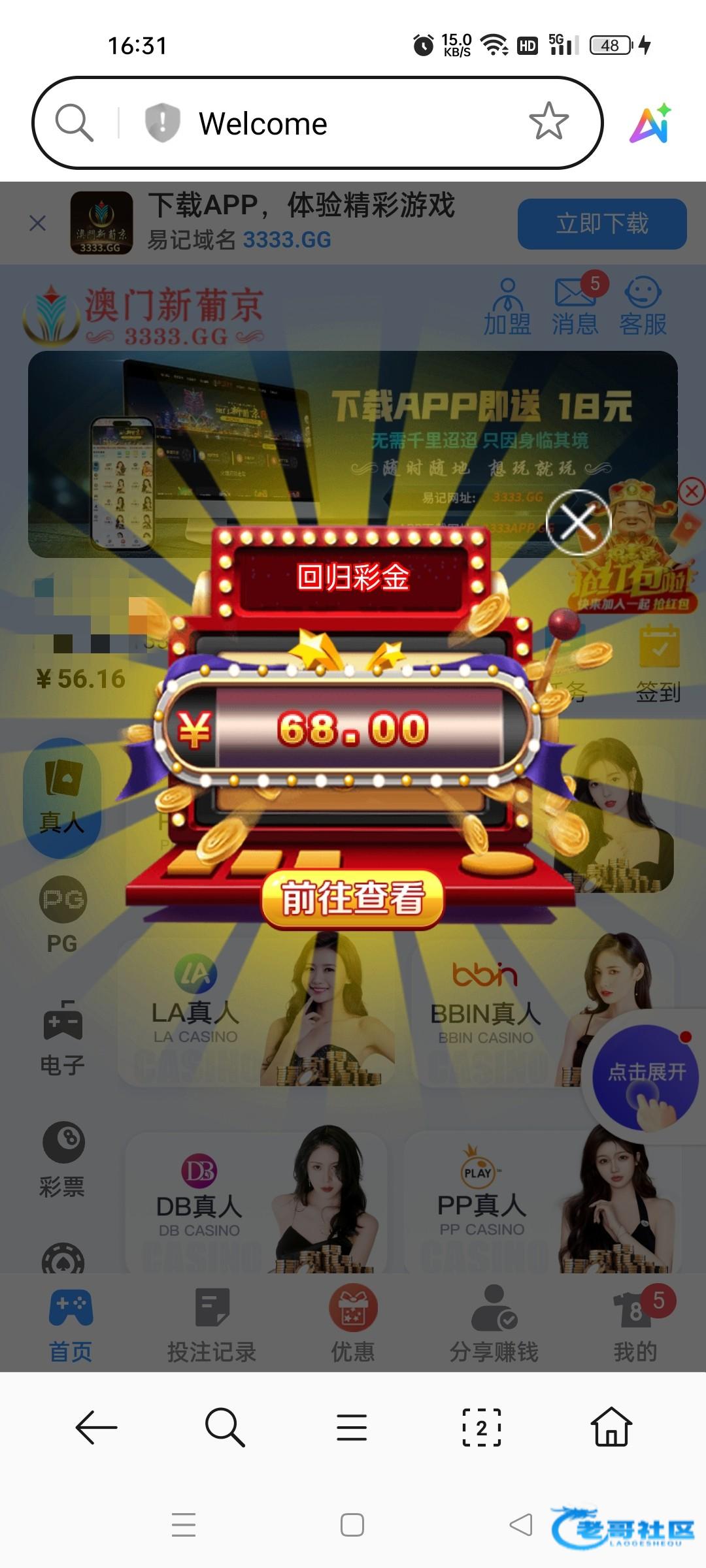 有号得登上去看看,送了68,登上去就弹出来,应该不限制游戏一杯水3333.gg