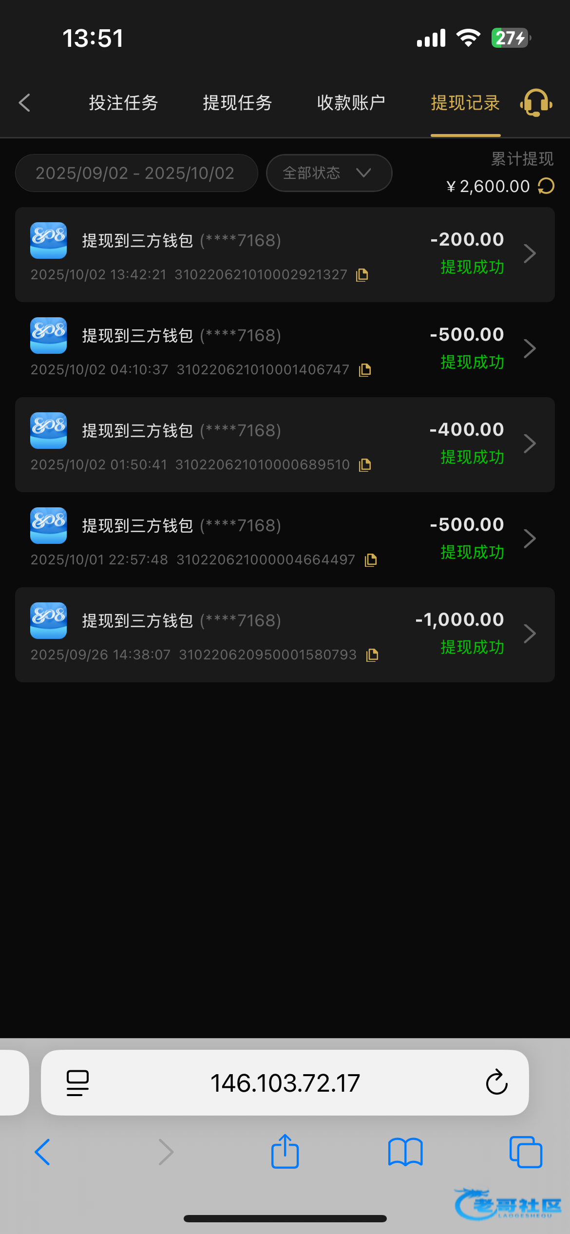 1号二个台子领了300多回馈,到今天一共白嫖了1300