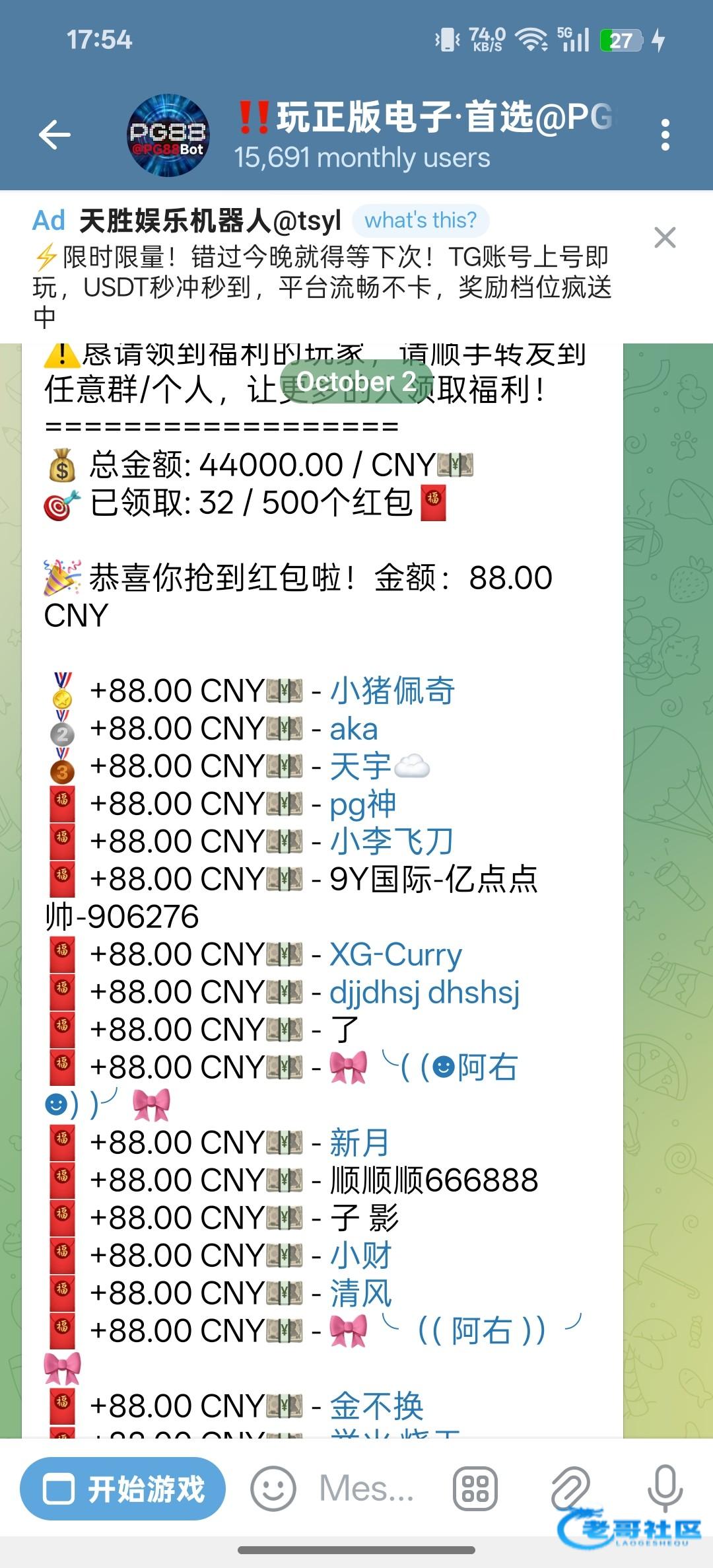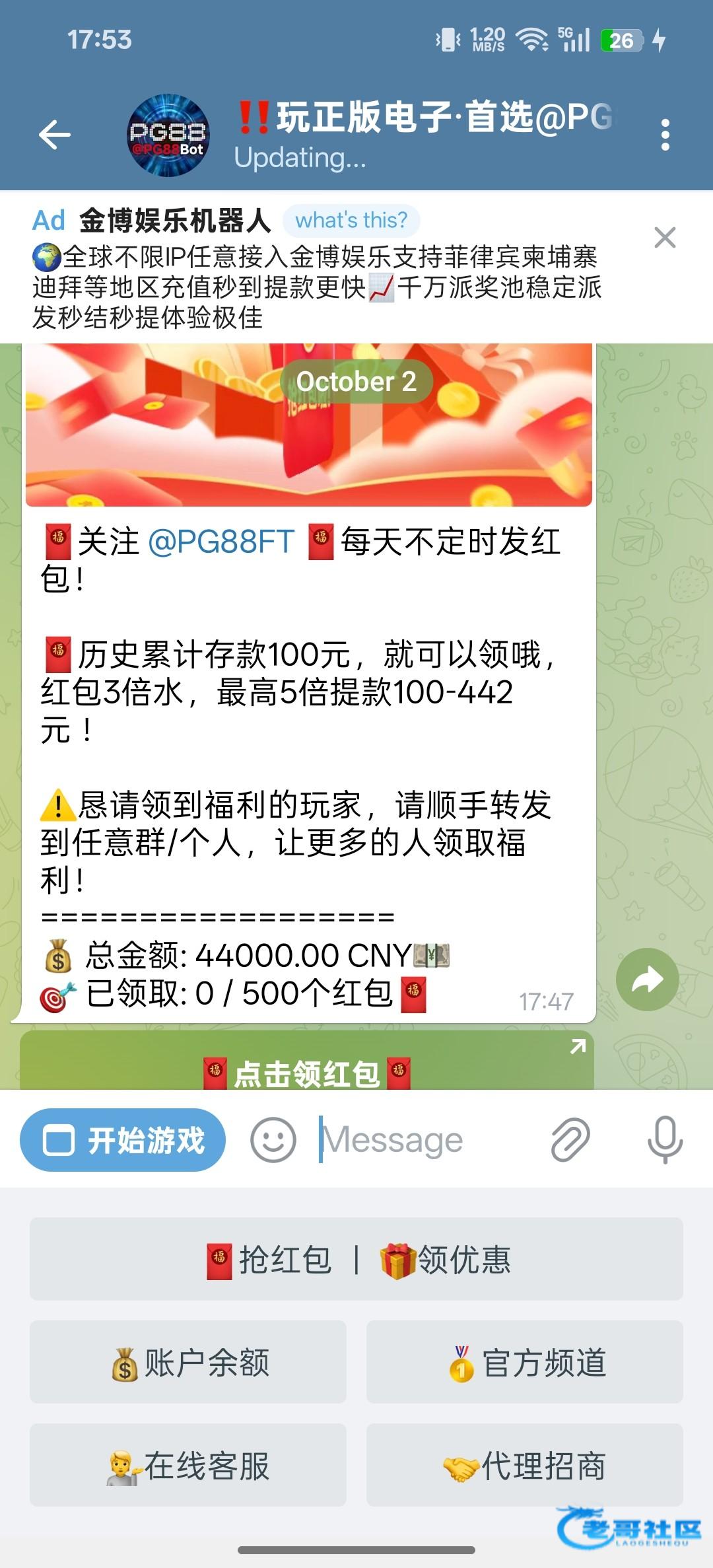 飞机关注pg88机器人,历史充值100+就可以领取,人人88,500个红包先到先得