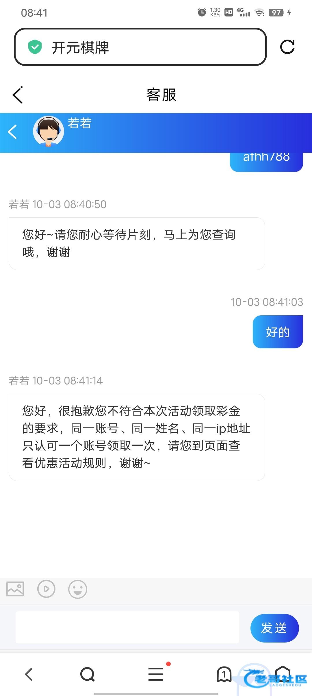 您好,很抱歉您不符合本次活动领取彩金的要求,同一账号、同一姓名、同一ip地址只认可一个账号领取一次,请您到页面查看优惠活动规则,谢谢~